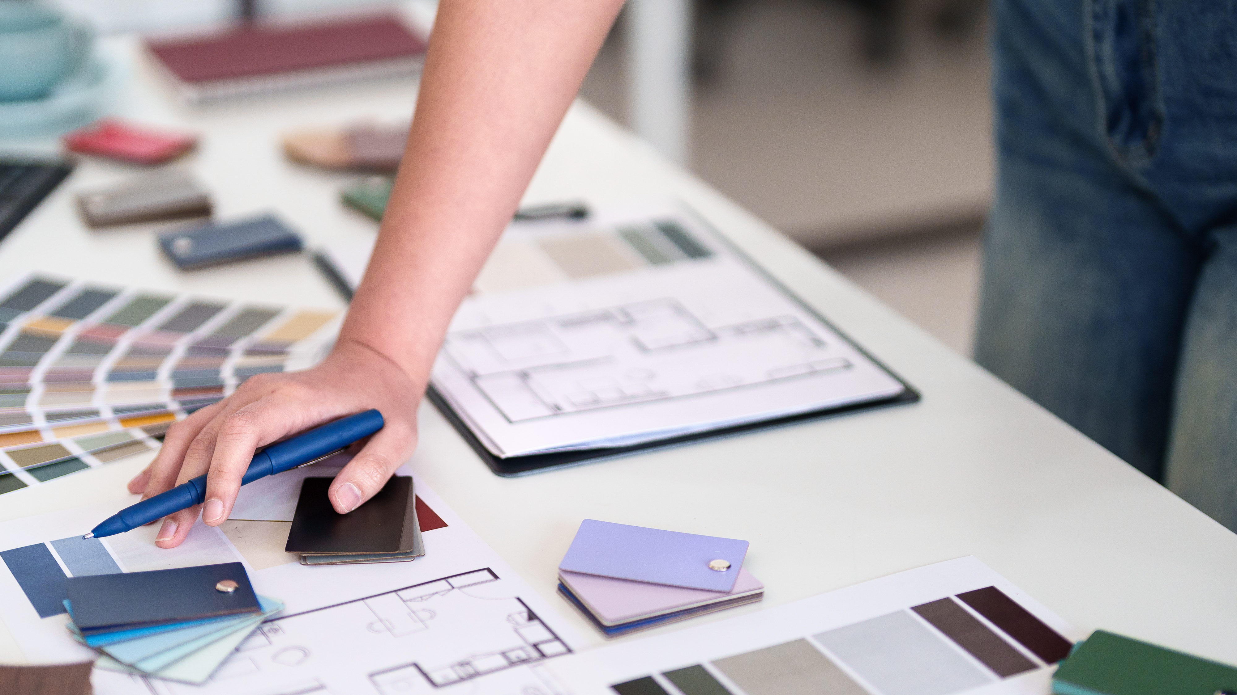 Created with images by Petr - "Creative workspace with hands arranging textures and color palettes" • CarlosBarquero - "Interior of modern and elegant dining room interior home. Empty space" • Rawpixel.com - "Businesswoman standing and using mobile phone" • Сергей Максименко - "Painting a textured wall with a roller in a residential space during home renovation" • Pixel-Shot - "Interior of beautiful modern room with green wall" • Supanan - "Explore a modern Scandinavian living room infused with geometric decor, showcasing sleek furniture, and embracing sustainable design elements Discover minimalist interior design ideas featuring" • Krakenimages.com - "Women employees discussing decor ideas in a well-lit home decor store interior with various decorations in the background" • Anna Studio - "Gallery wall, home decor and wall art, framed art in modern English country cottage interior, living room for diy printable artwork and print shop idea" • pathdoc - "Dreaming man isolated over drawn living room background." • whyframeshot - "topview of material surface sample stone, wood veneer ,laminate color chart interior schematic design ideas concept" • New Africa - "Comfortable sofa, nesting tables, green house plants, ottoman, floor lamp and pendant lights on white background. Interior design" • STBSTD - "Design Decisions: An interior designer meticulously reviews blueprints, color swatches, and material samples on a workspace, planning the aesthetics of a new project."