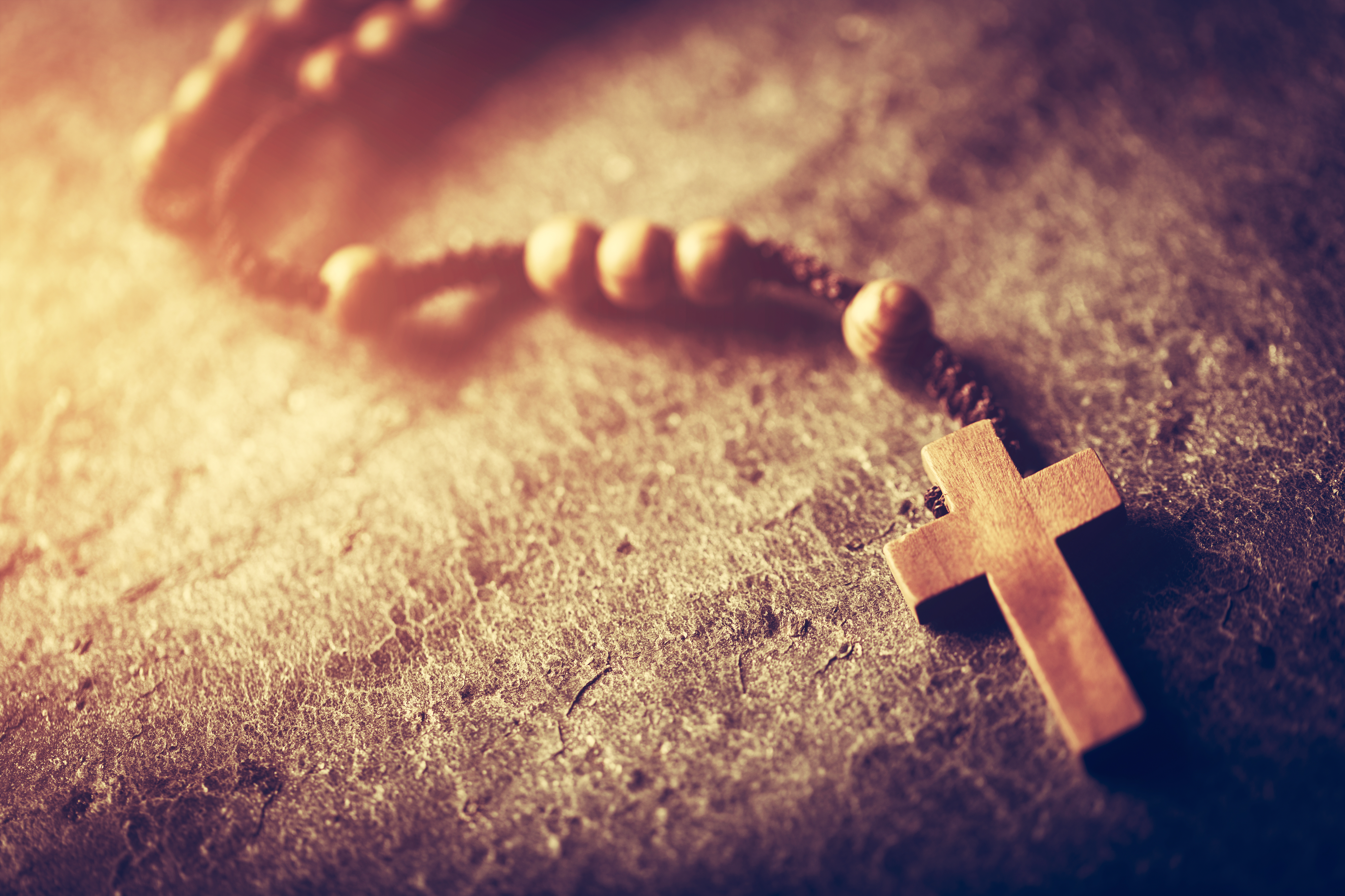 Created with images by Photocreo Bednarek - "Wooden rosary with cross on stone background." • Michael - "Low dusty mist blowing across the desert floor at sunset with mountains in the background" • Sinta - "Bright Sunburst with Sky, and Clouds."