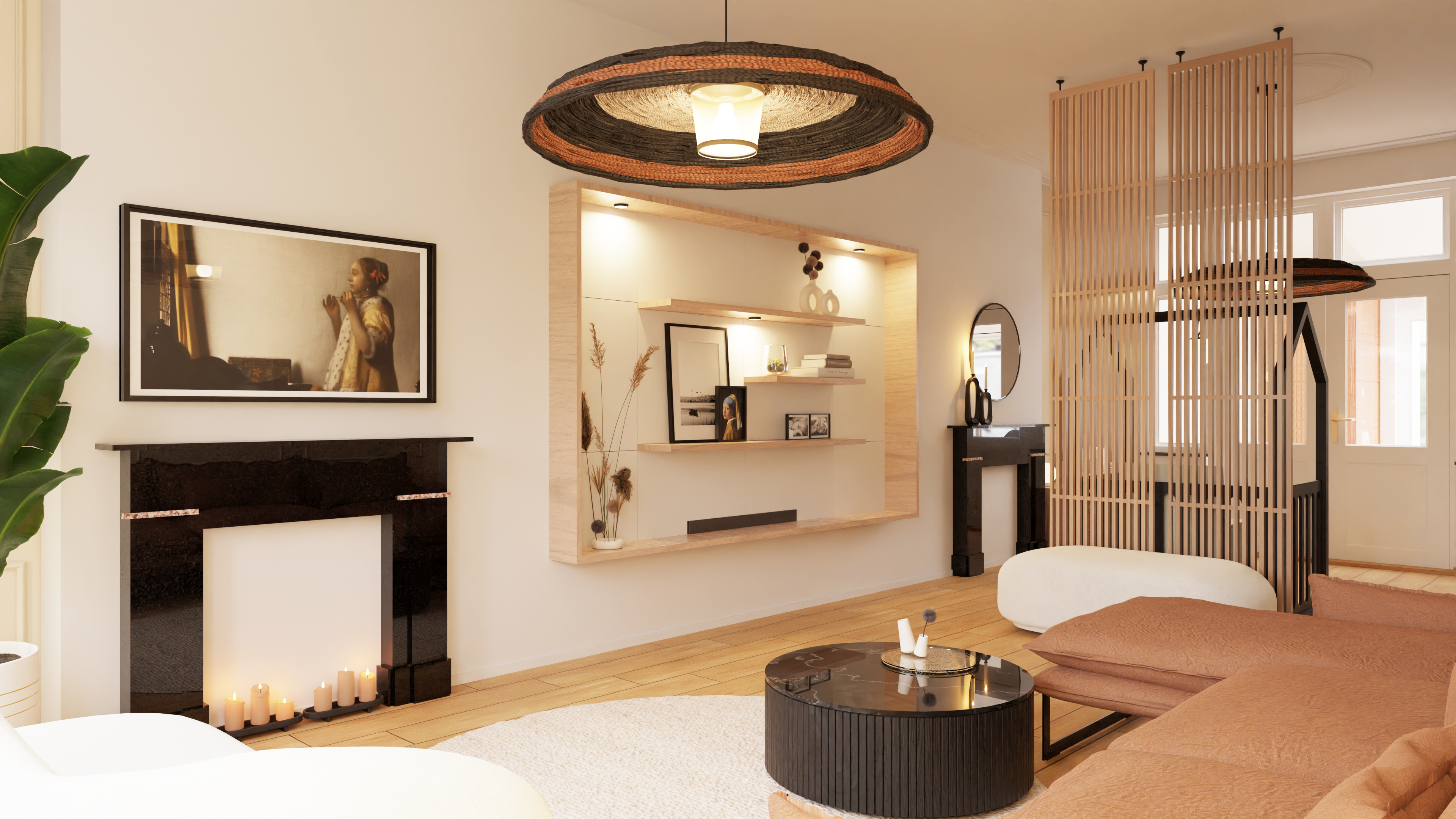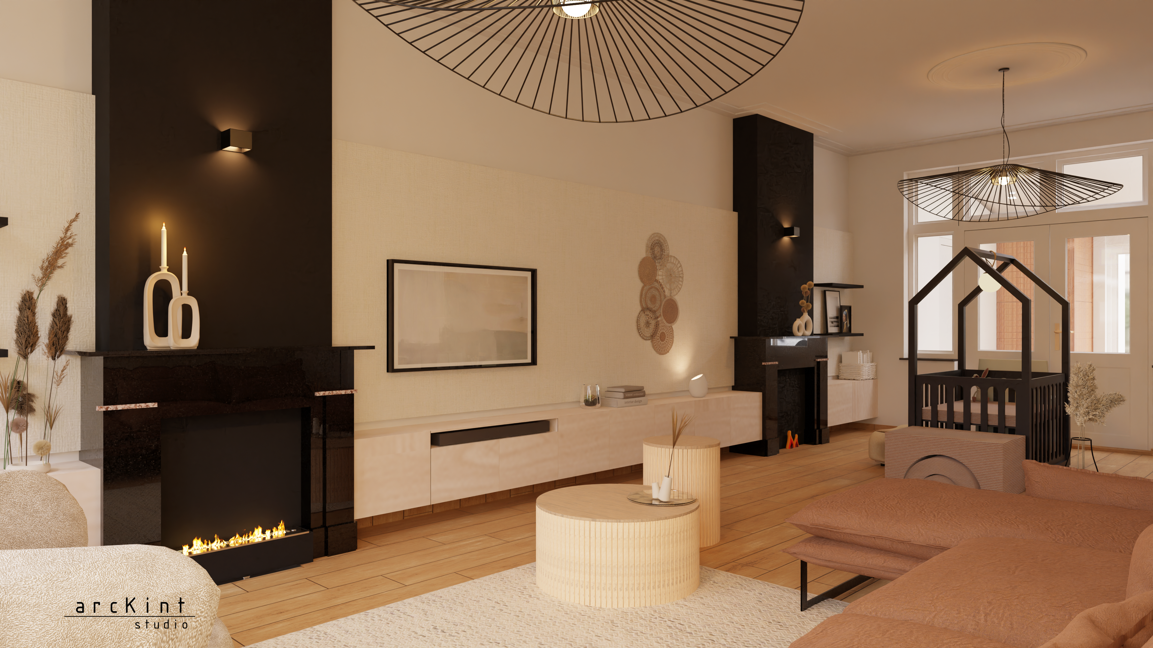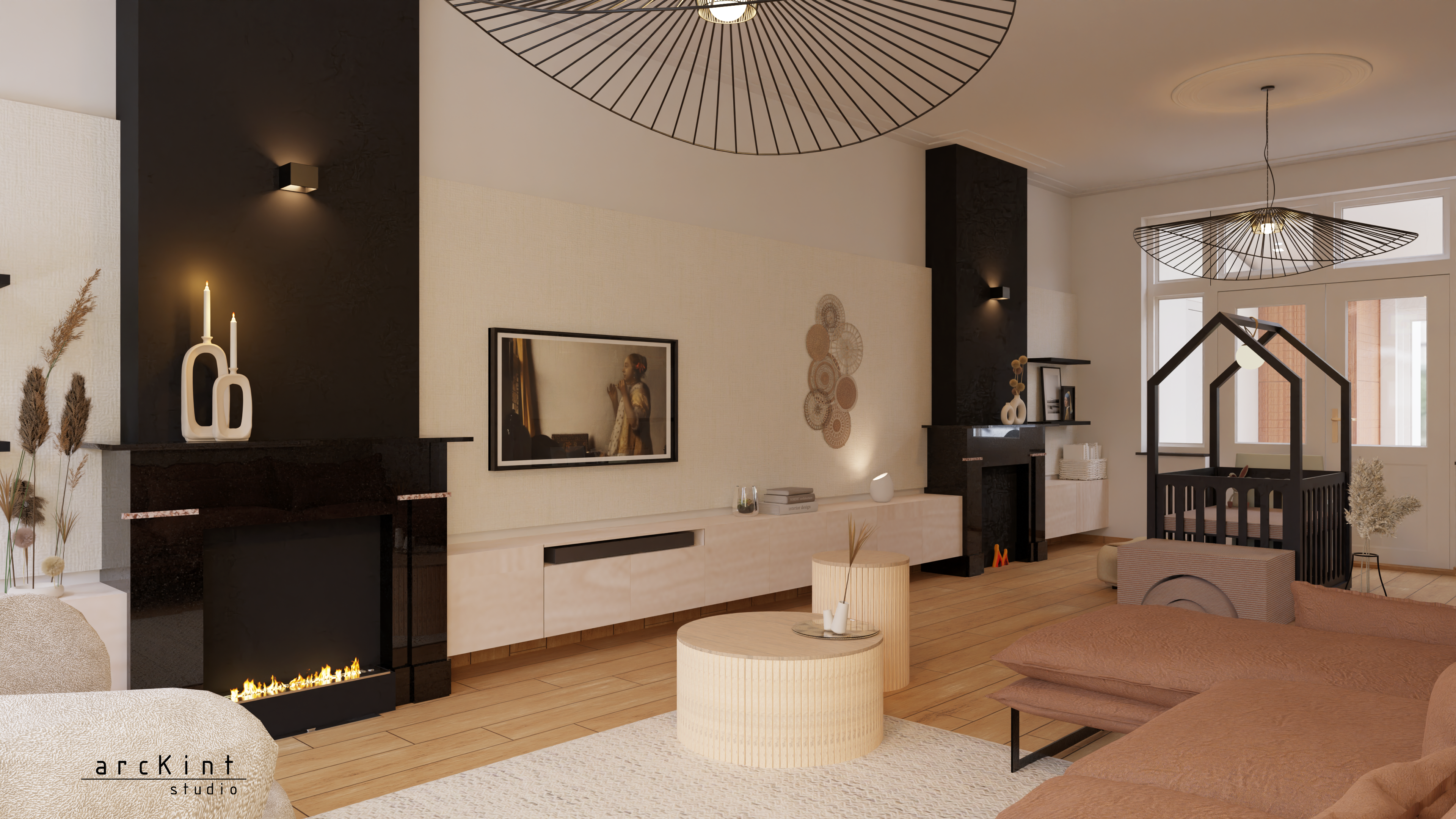 Voor opbergmogelijkheden stel ik een lang zwevende kast voor, langs de hele lengte van de wand met de schouwen. Een wandpaneel maakt het mogelijk de ongewenste kabels van de TV, soundbar en tafellampen weg te werken, wat diepte en uniformiteit aan die wand geeft.