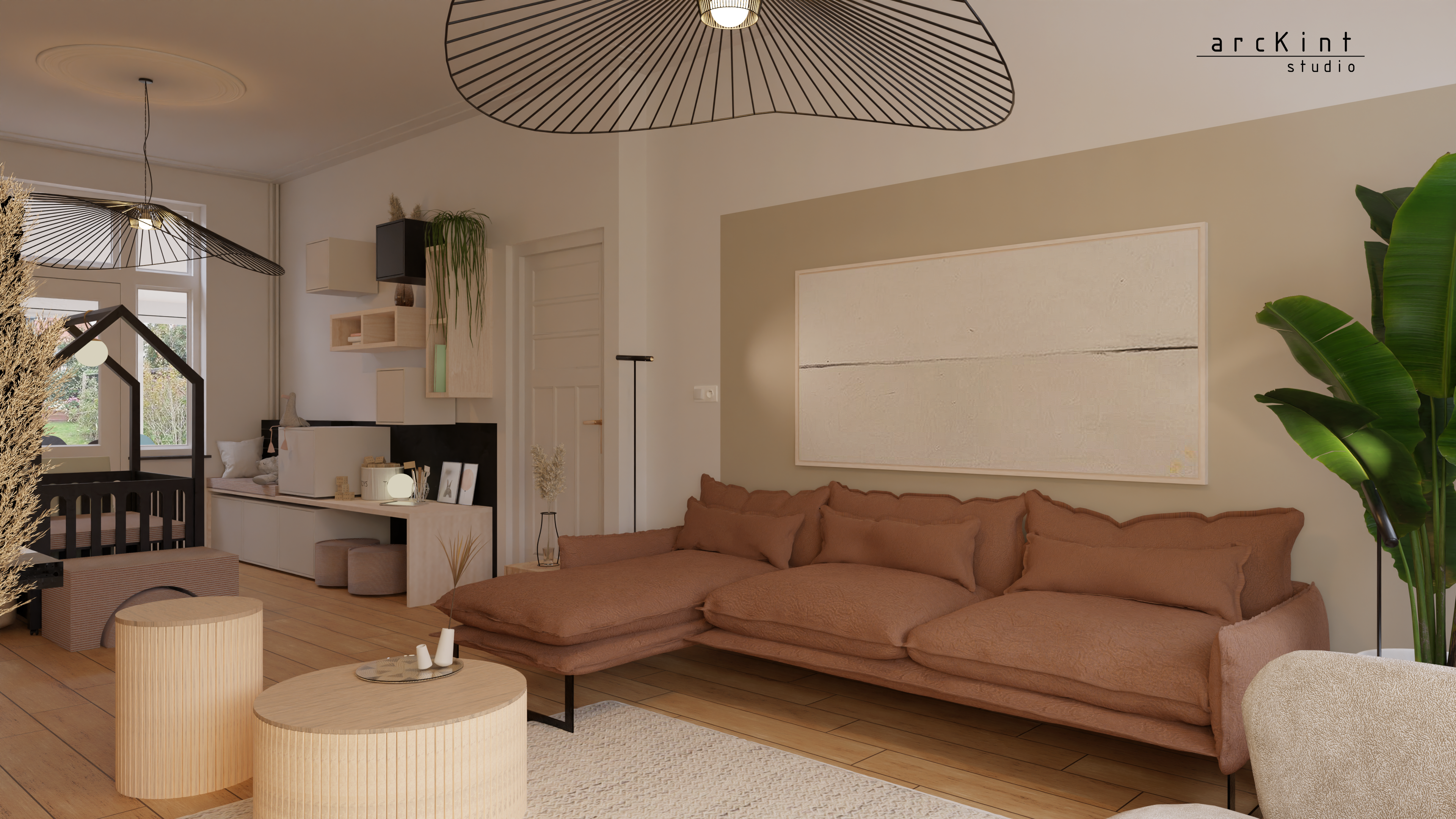 Twee kamerhoge houten roomdividers begrenzen het zitgedeelte en dienen tegelijkertijd als achtergrond voor het knusse babybox-plekje.