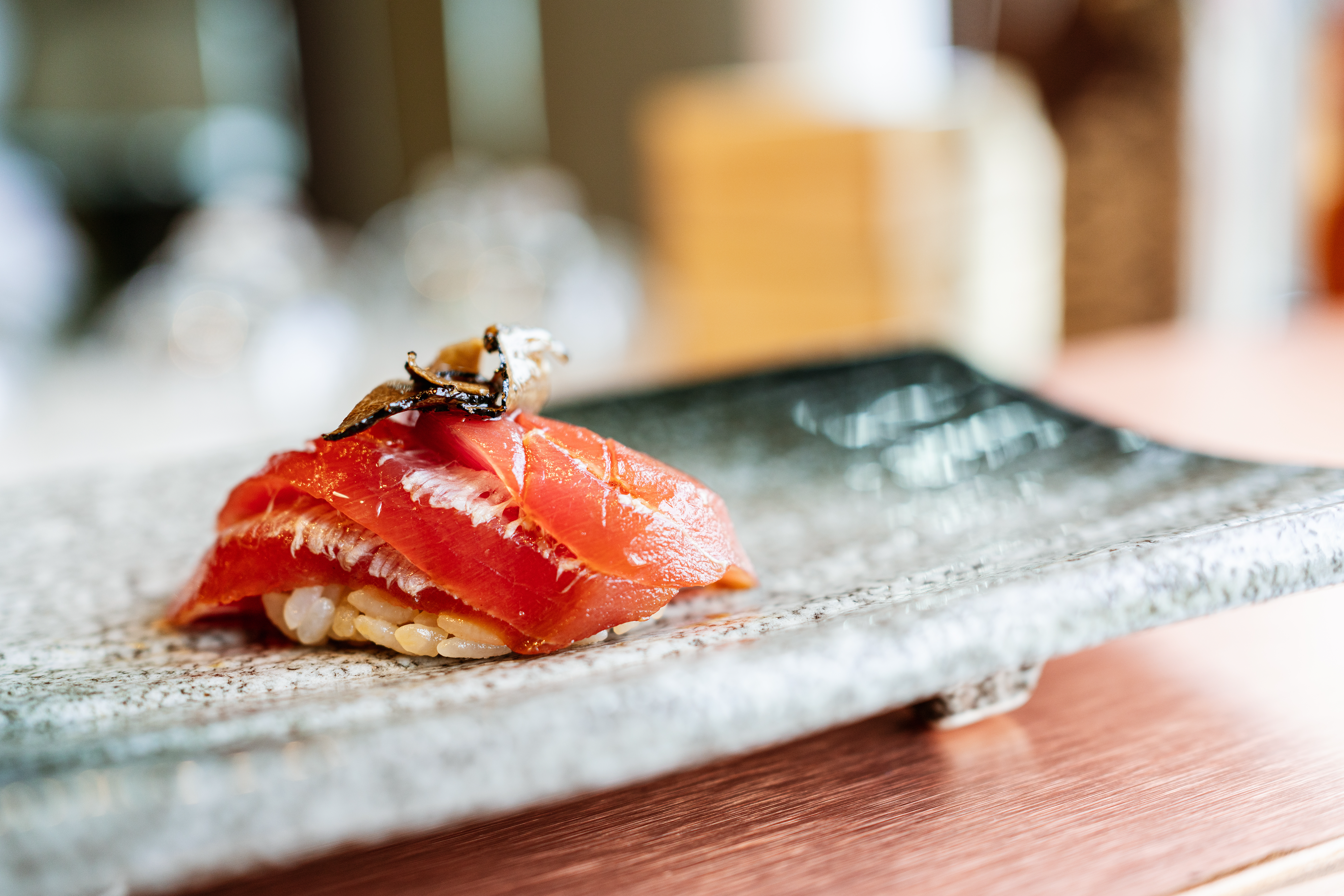 Bluefin Chu toro Bluefin Chu Toro topped with Truffle oil, Enoki Mushroom, Black Truffle, and Nigiri