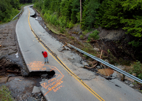 David Knowles checks out a damaged stretch of Woodville Road. following Friday evening's epic rainstorm, in West Hants, NS Saturday, July 22, 2023. Knowles gave the road a hard pass and decided to drive around to check out the family farm. Four people were swept away and died during the devastating storm.