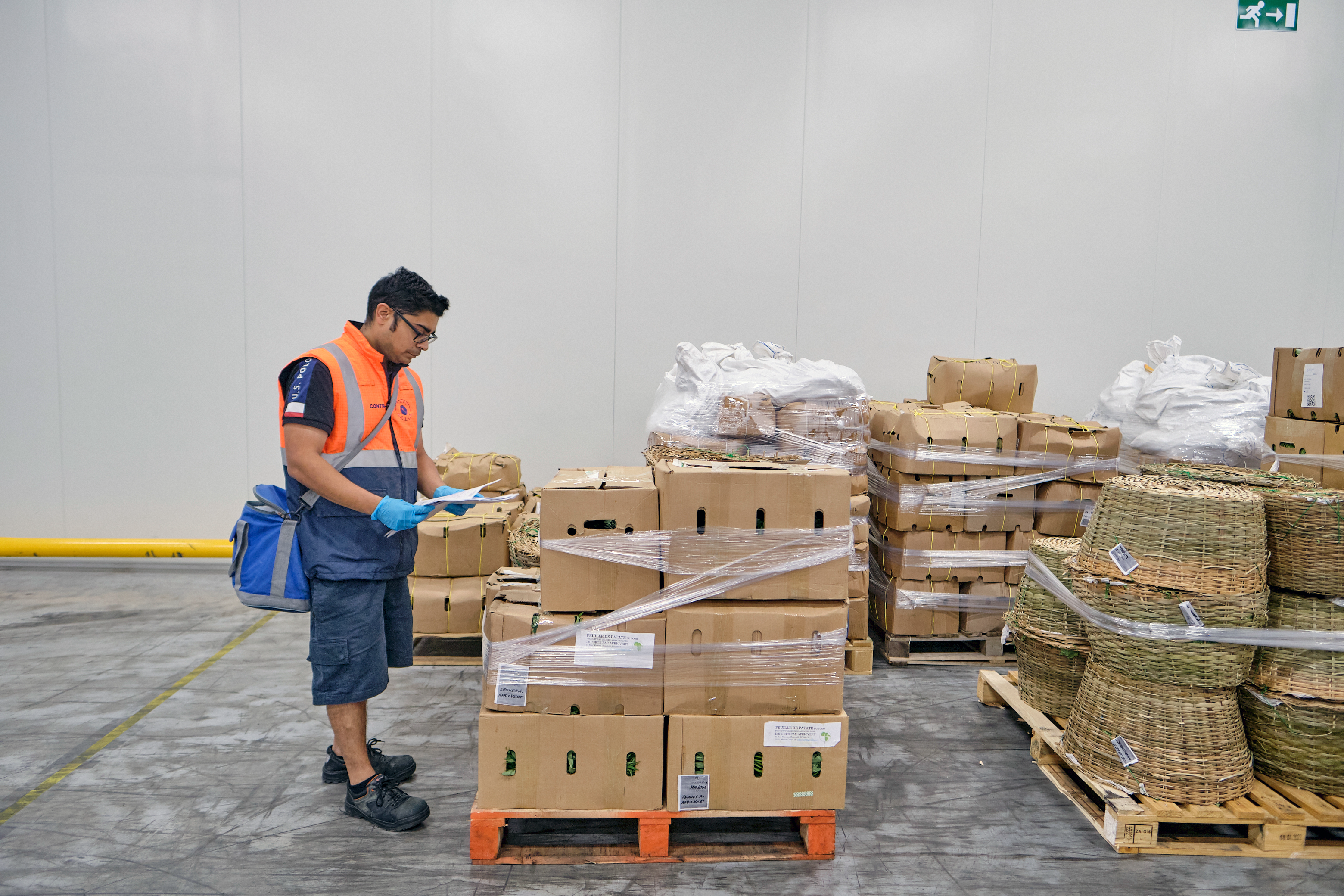 FAVV-controleur Pramit kijkt de groenten, fruit, planten en producten van plantaardige oorsprong na die ons land via de luchthaven binnenkomen. "Er zijn bepaalde categorieën die we altijd controleren omdat de kans dat ze schadelijke organismen met zich meebrengen, reëel is. Zo controleren we steeds alle aubergines, mango’s en sierplanten die ons land binnenkomen van buiten de Europese Unie.”