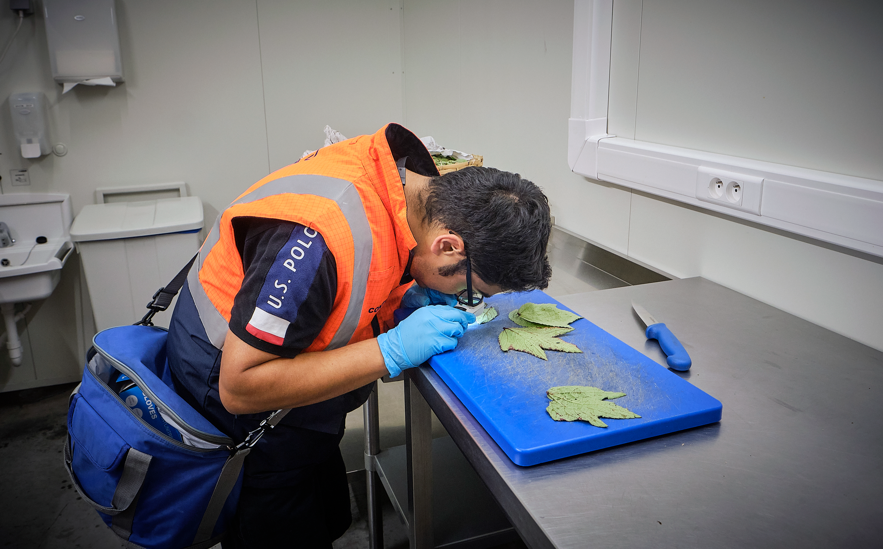 Pramit vermoedt dat de bladeren geïnfecteerd zijn met Bemisia, een witte vliegsoort uit tropische streken die heel wat plantenvirussen kan overbrengen en zo aanzienlijke oogstschade kan aanrichten. Het is een van de meest invasieve soorten ter wereld en heeft resistentie ontwikkeld tegen alle belangrijke klassen van pesticiden. Pramit steekt een staal in een plastieken buisje en zal dat naar het labo sturen om zijn vaststelling te laten verifiëren. In afwachting wordt de gecontroleerde container afgesloten met rode tape: de kleur van ‘No Go’. Als het labo de vermoedens van Pramit bevestigt, zal de importeur de keuze krijgen: de bladeren vernietigen, terugsturen naar Togo of laten verwerken op een manier dat ze geen schade meer kunnen aanrichten.