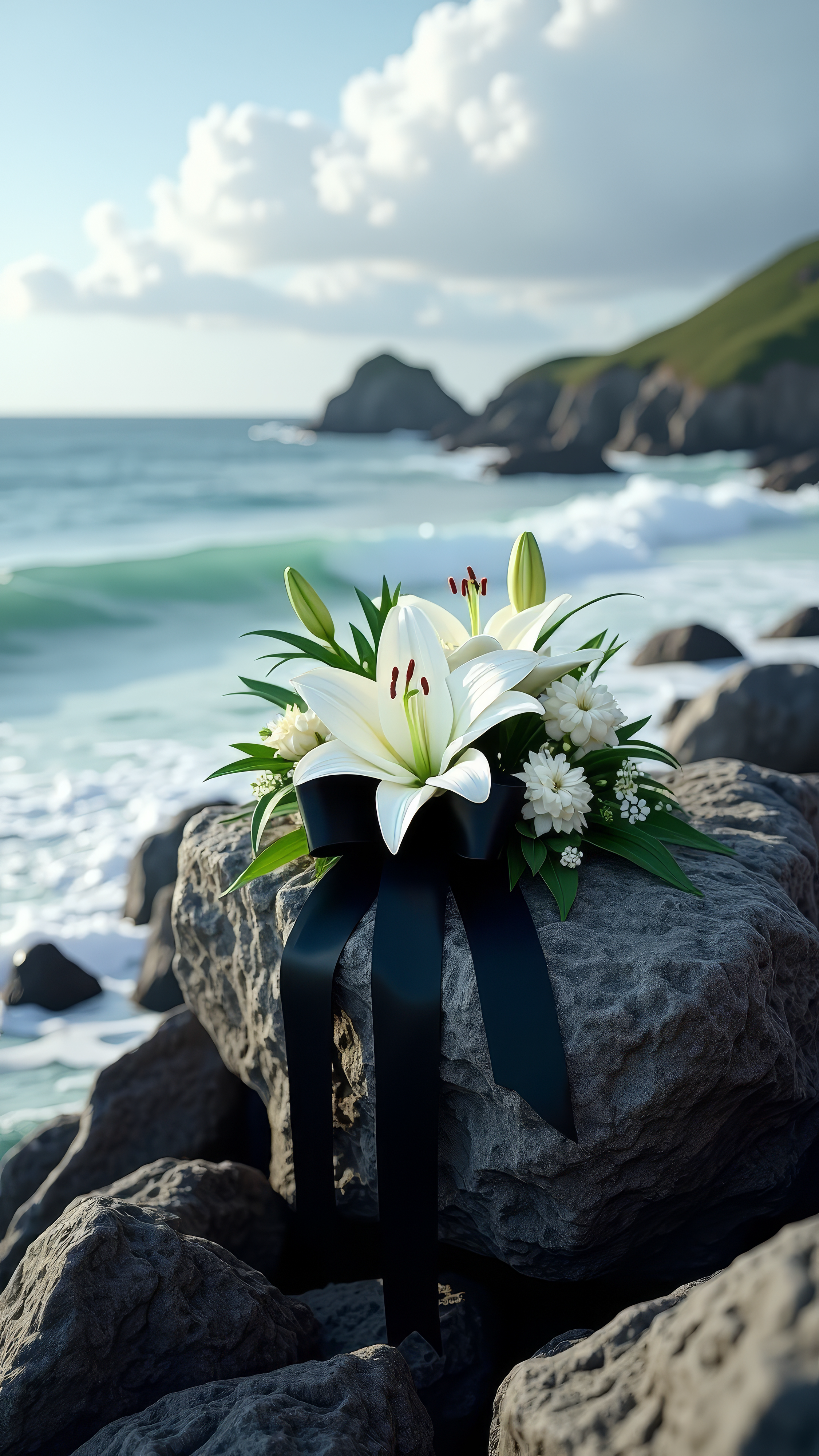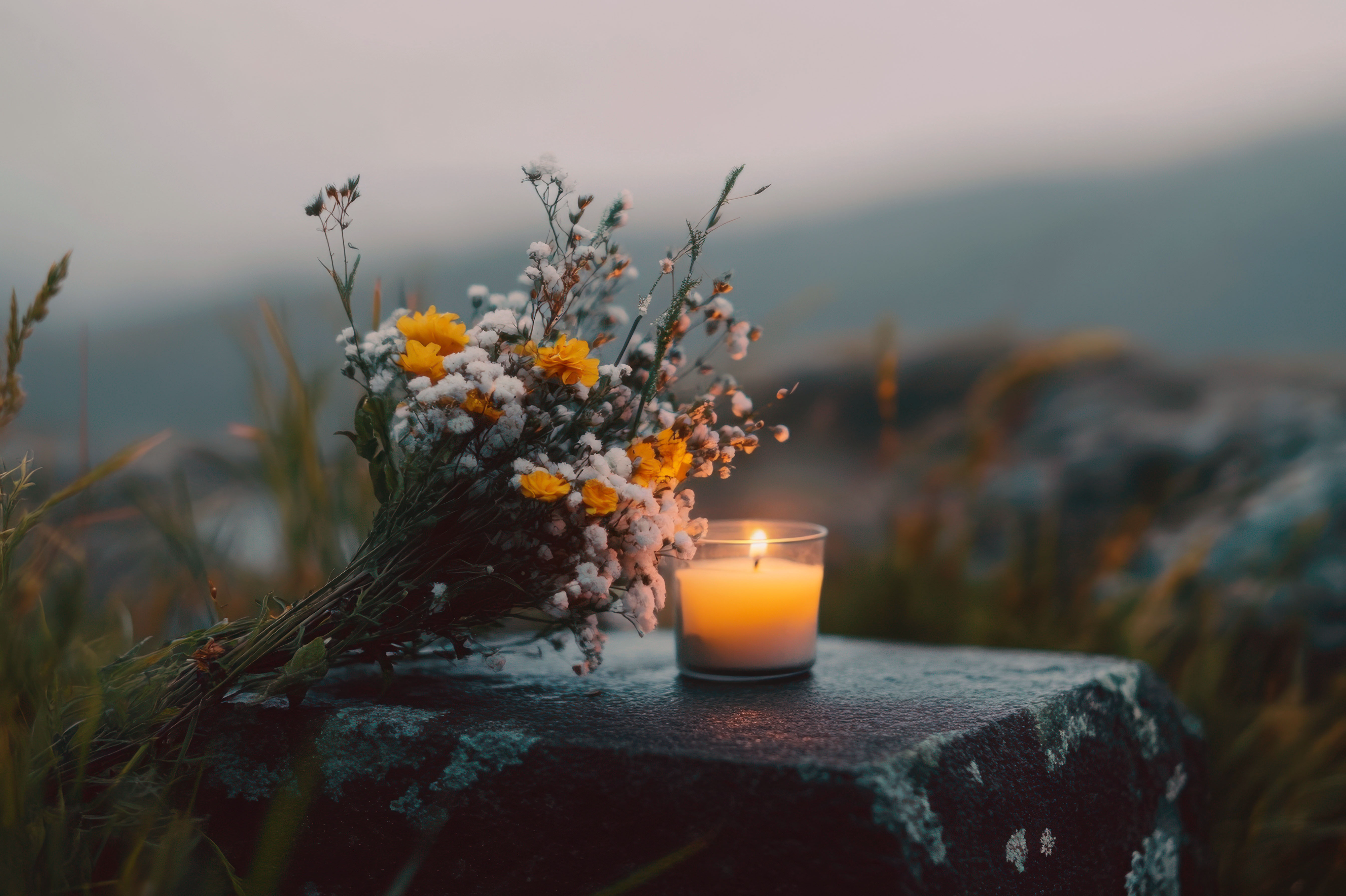 Erstellt mit Bildern von Thares2020 - "Floral Memorial Bouquet Against Serene Sunset Landscape Honoring Passage of Time" • phogura - "Holzurne und Blumenschmuck, Waldbestattung" • CineLens/peopleimages.com - "Hands, rose and a person at a funeral in a cemetery in grief while mourning loss at a memorial service. Death, flower and an adult in a suit at a graveyard in a crowd for an outdoor burial closeup" • sc Fotografie - "Lila Blüte in Feld" • Nadezhda - "Reflective Memorial Urn on Rocky Beach at Sunset" • vivekFx - "A bouquet of white lilies on a rocky beach, symbolizing grief and remembrance" • Patrick Daxenbichler - "Candle at the cemetery, funeral" • Iryna - "Amid the solemnity of the funeral, the wooden coffin is sent on its last journey, accompanied by a poignant composition of flowers that speak of the depth of human emotions." • T.Den_Team - "Atmosphere 90s-80s-70s, aesthetic old photos albums, fashion trend on a retro vibes " • Oleh - "various percussion instruments from seeds for meditation and relaxation" • Giuseppe Cammino - "A statue of Mary is surrounded by candles in a church" • Giuseppe Cammino - "A statue of Mary is surrounded by candles in a church" • anzodesign - "A serene gravestone with a glowing candle and a bouquet of fresh flowers in nature", Fotos Nina Weiss