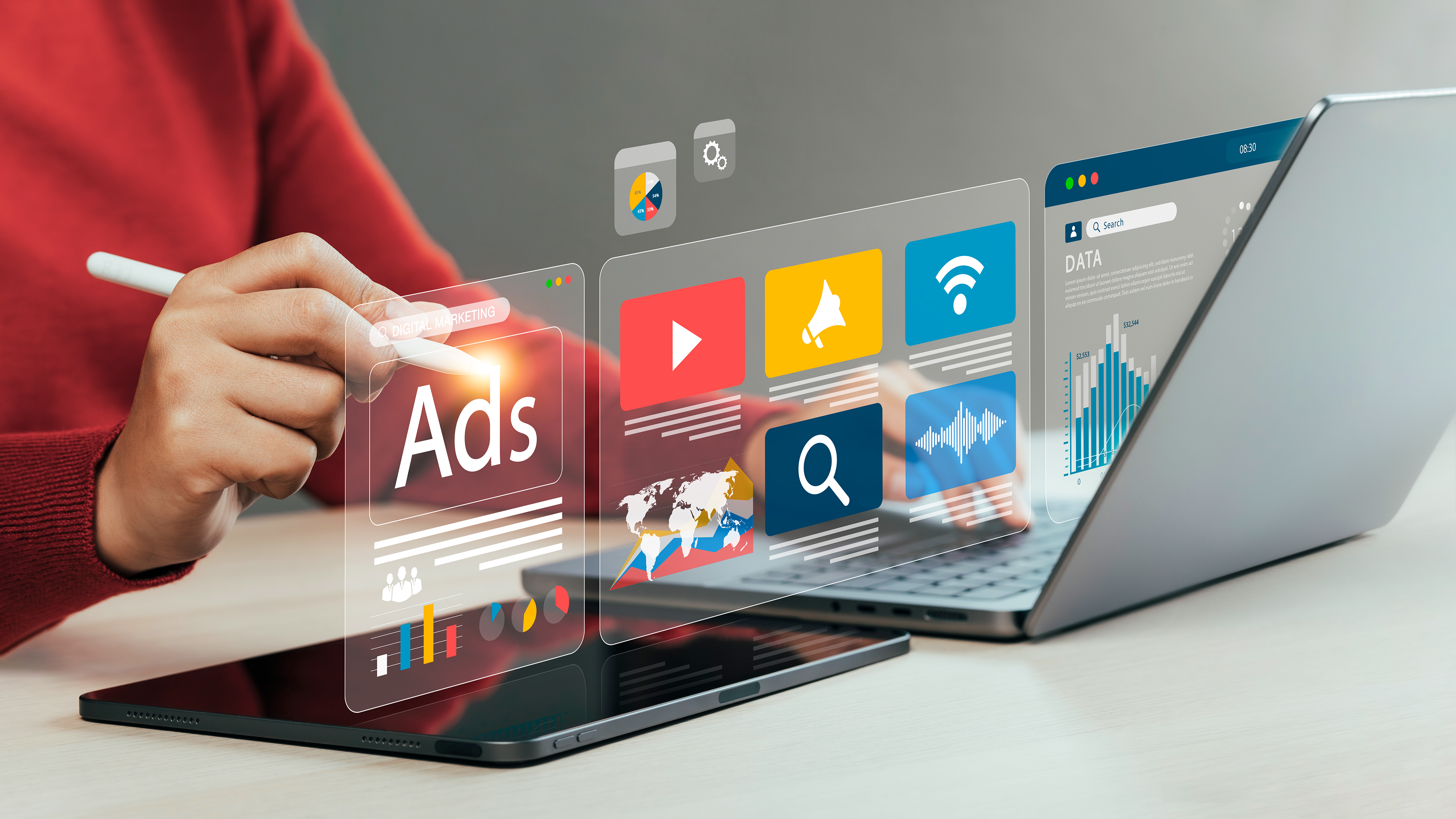 Created with images by Valentyna - "Winter solstice celebration with bonfires and lanterns, festive atmosphere" • Dee karen - "Online sales concept of digital marketing, ad, product ads, promotion of products or services through digital tools. Online advertising concept Internet advertising digital marketing Social media"