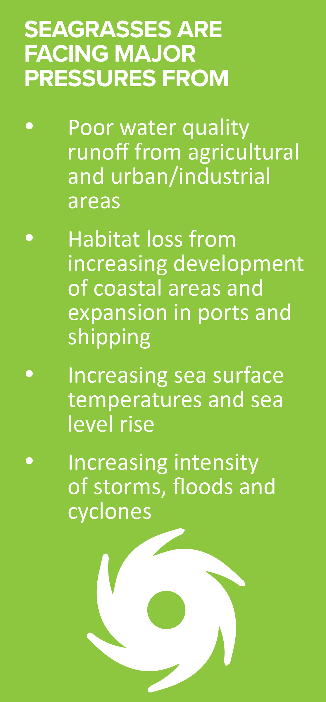 As they grow, seagrasses form networks of underground stems called rhizomes, which trap and stabilise sediment and absorb nutrients, improving water quality. One hectare of seagrass can absorb 1.2kg of nutrients per year, equal to the treated effluent from 200 people! This helps to improve the health of nearby coral reefs.