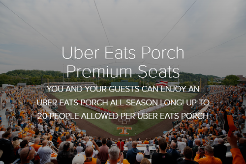 Uber Eats Porches include a unique experience for fans at Lindsey-Nelson Stadium. Each Uber Eats Porch includes 20 tickets as well as a grill, heater, table with high top chairs, and the opportunity to bring your own food and beverages to the game. Grill out with your friends as you cheer on the Vols!