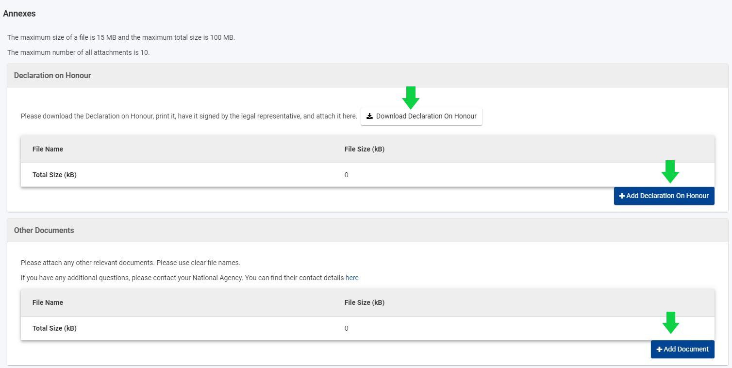 U ovom dijelu prijavnog obrasca (Privitci) obavezno prilažete dokument Declaration on Honour (Izjava o časti). Izjavu o časti najprije preuzimate i spremate na svoje računalo odabirom Download, a nakon što je pravilno ispunite i potpišete, potrebno ju je skenirati i učitati u sustav odabirom Add Declaration on Honour.