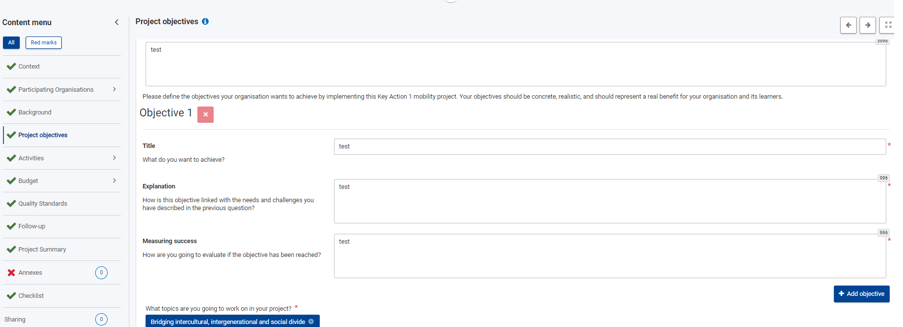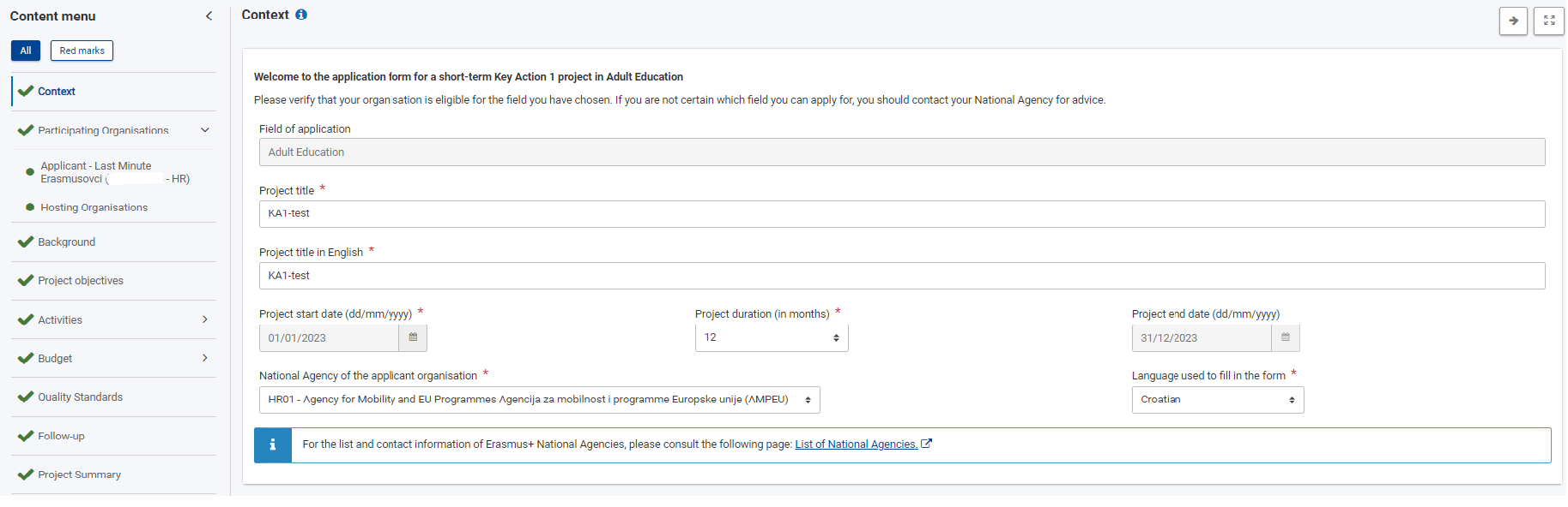 Nakon što otvorite relevantan prijavni obrazac (područje u kojem je vaša organizacija prihvatljiv prijavitelj i odgovarajući tip ključne aktivnosti), krenite redom, slijedeći izbornik na lijevoj strani obrasca u kojem su vidljivi svi dijelovi prijave koje je potrebno ispuniti. Određeni ispunjeni dijelovi obrasca uvjetuju otvaranje novih dijelova, a određeni segmenti automatski se popunjavaju unosom podataka u neki od prethodnih dijelova prijave. Sva polja označena crvenom zvjezdicom obavezna su za unos. Nakon što je određeni dio obrasca ispunjen u cijelosti, u izborniku će se pojaviti zelena kvačica. Broj znakova koji možete upisati u polja predviđena za unošenje teksta ograničen je i uvijek se prikazuje u desnom gornjem kutu polja za unos teksta.