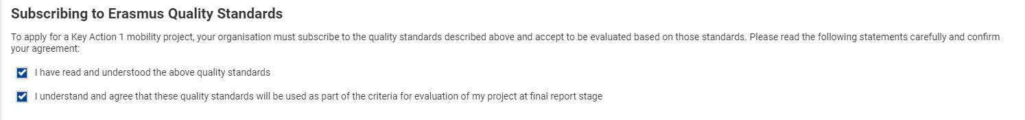 Pažljivo pročitajte Erasmus standarde kvalitete u prijavnom obrascu te im se vraćajte tijekom pisanja prijave kako biste osigurali njihovu primjenu u svim aspektima provedbe projekta. Nakon čitanja standarda kvalitete potrebno je potvrditi da ih vaša organizacija razumije i prihvaća te pristaje da se isti koriste kao dio kriterija vrednovanja kvalitete projekta u fazi procjene završnog izvješća.