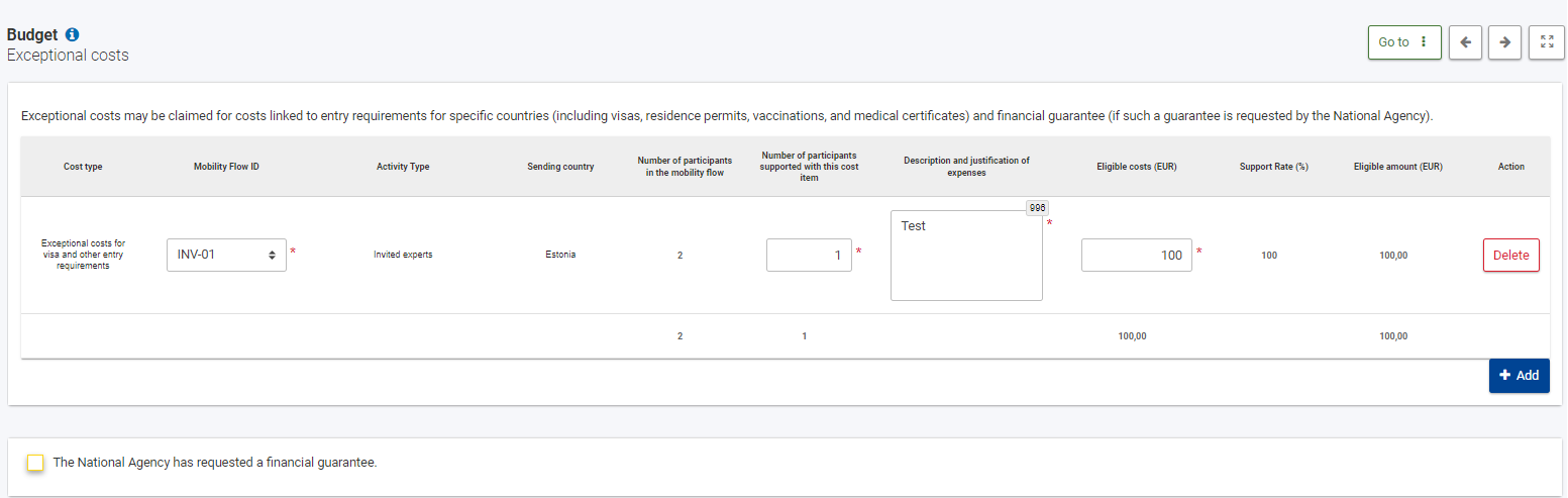 9) Exceptional costs (izvanredni troškovi) - kroz ovu kategoriju mogu se zatražiti troškove za vize i s njima povezani troškovi za boravišne dozvole, cijepljenja, liječničke potvrde i sl. Potrebno je unijeti broj sudionika za koje je planiran trošak te jasno i detaljno objasniti potrebu za troškom i unijeti iznos. Ti se troškovi priznaju u punom iznosu (100% ). Napomena: pročitajte u Vodiču uvjete za ostale izvanredne troškove (skupa putovanja, financijsko jamstvo itd).
