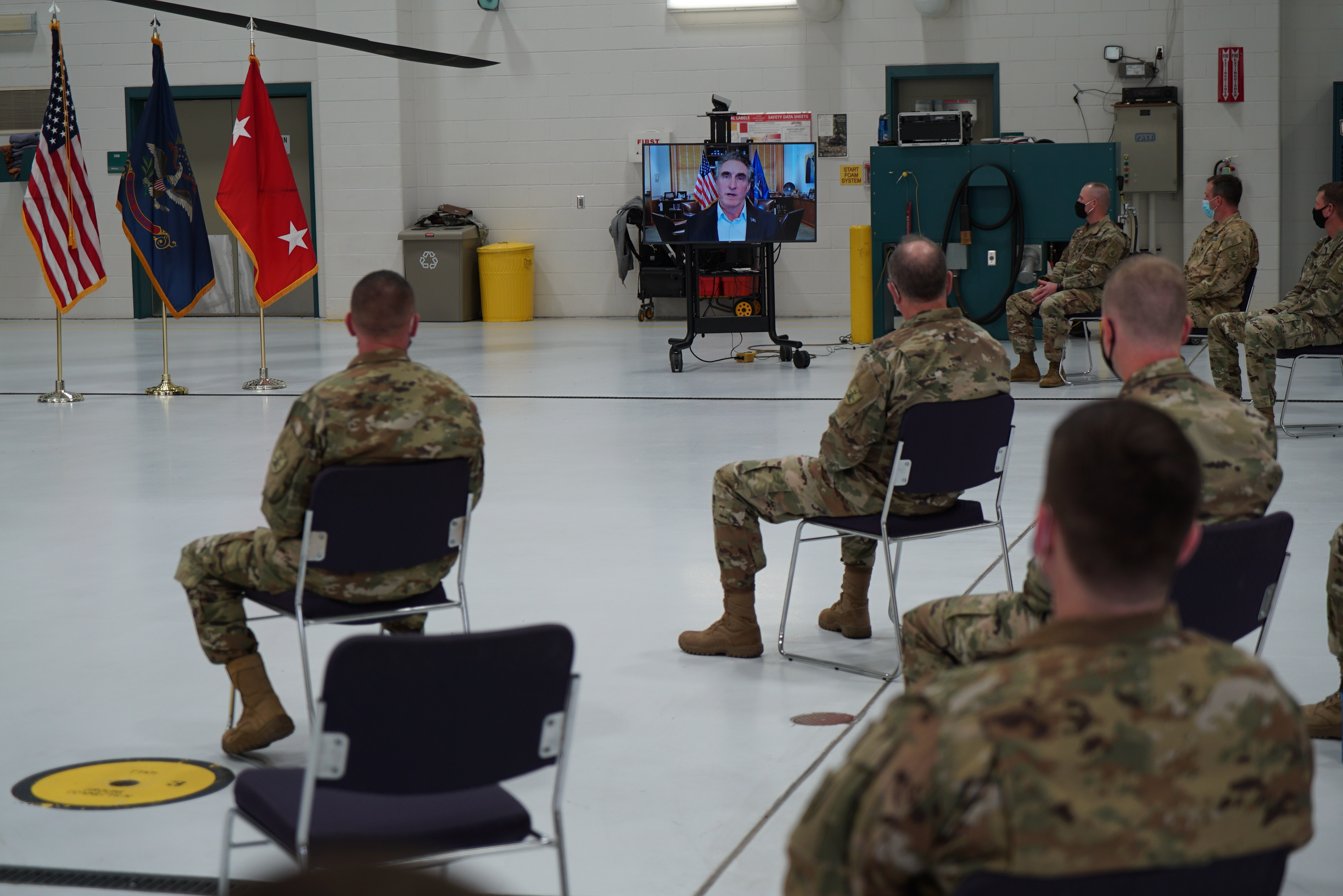 Top photo: N.D. National Guard leaders and Soldiers watch Gov. Doug Burgum deliver a message virtually to the Soldiers of Company C, 2nd Battalion, 285th Aviation Regiment during the unit's sendoff ceremony in Bismarck, N.D. on Oct. 25, 2020.