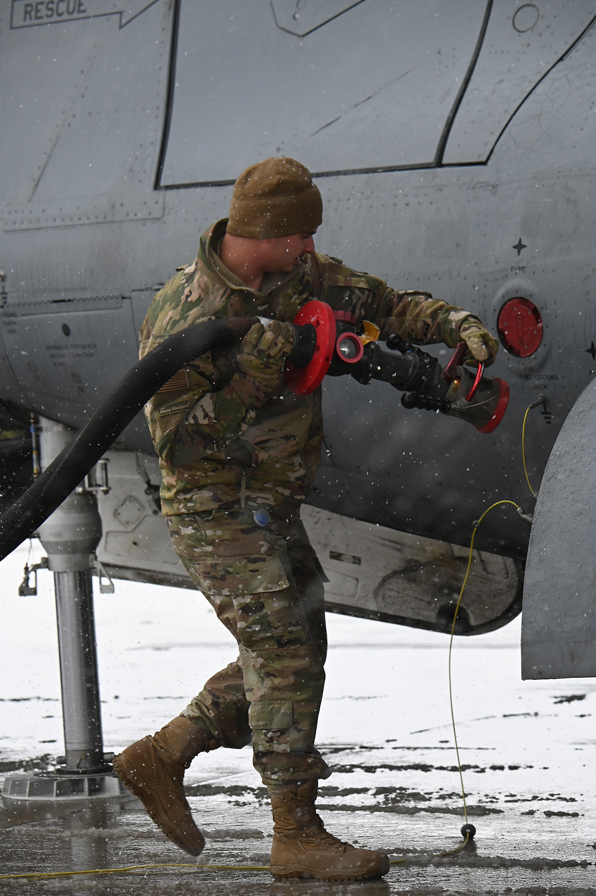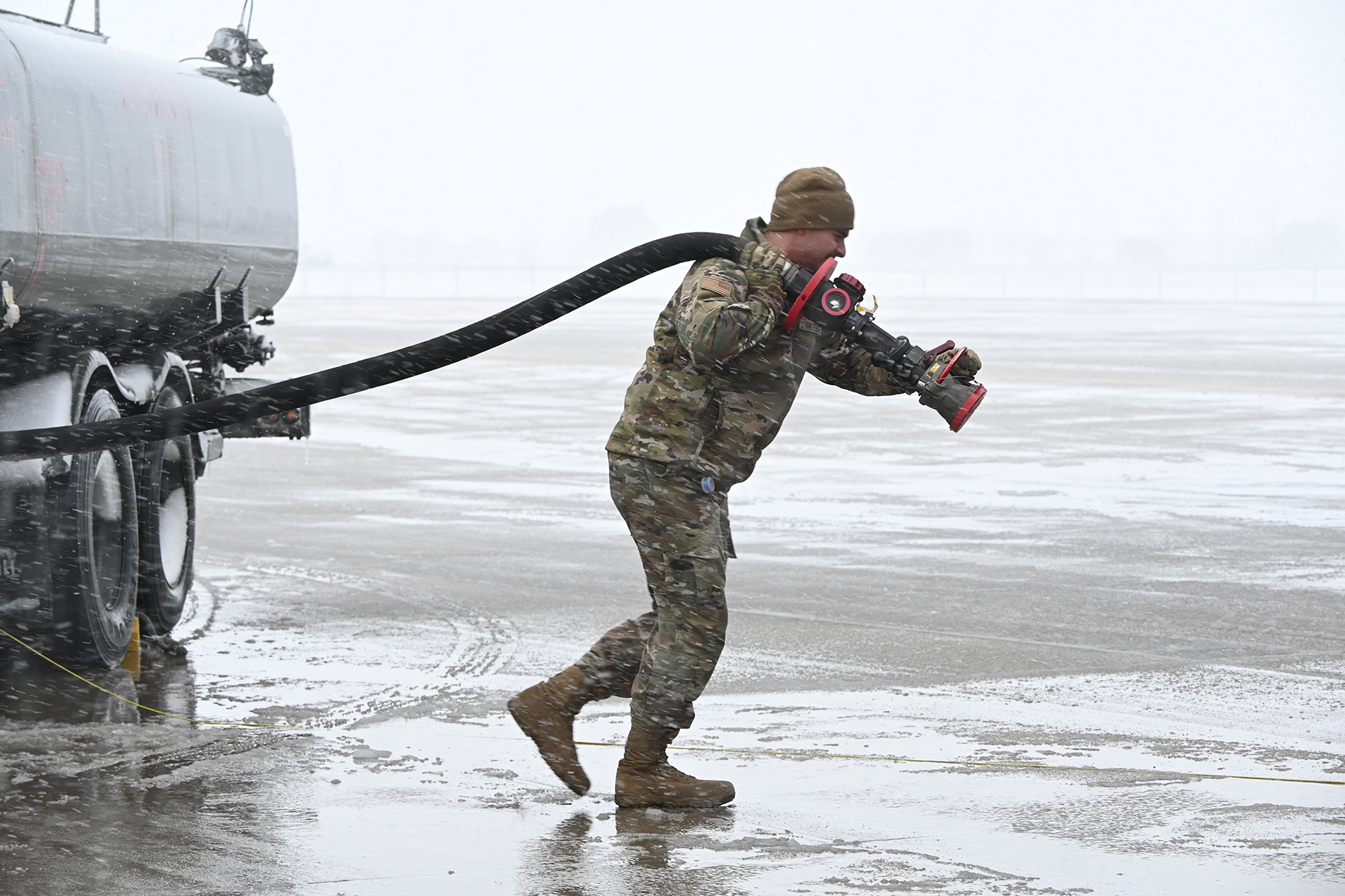 The 119th Wing's 119th Logistics Support Squadron is always prepared to perform their mission regardless of weather conditions, seven days a week, 24 hours a day. Airman Nate Rolph refueled a visiting C-17 Globemaster aircraft in freezing temperatures with a 15 mph wind at the N.D. Air National Guard Base, Fargo, N.D., on Oct. 20, 2020. (U.S. Air National Guard story and photos by Chief Master Sgt. David H. Lipp, 119th Wing)