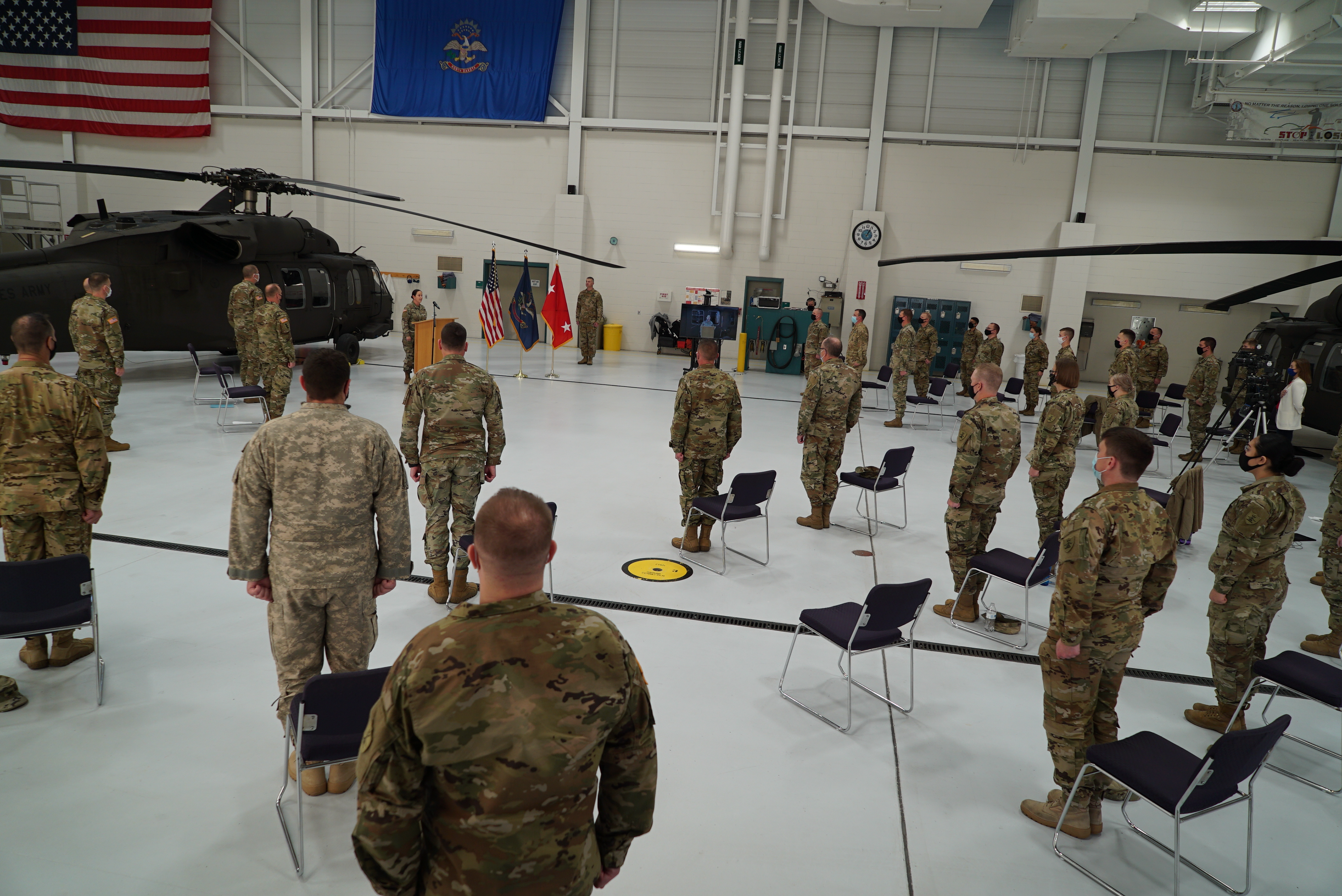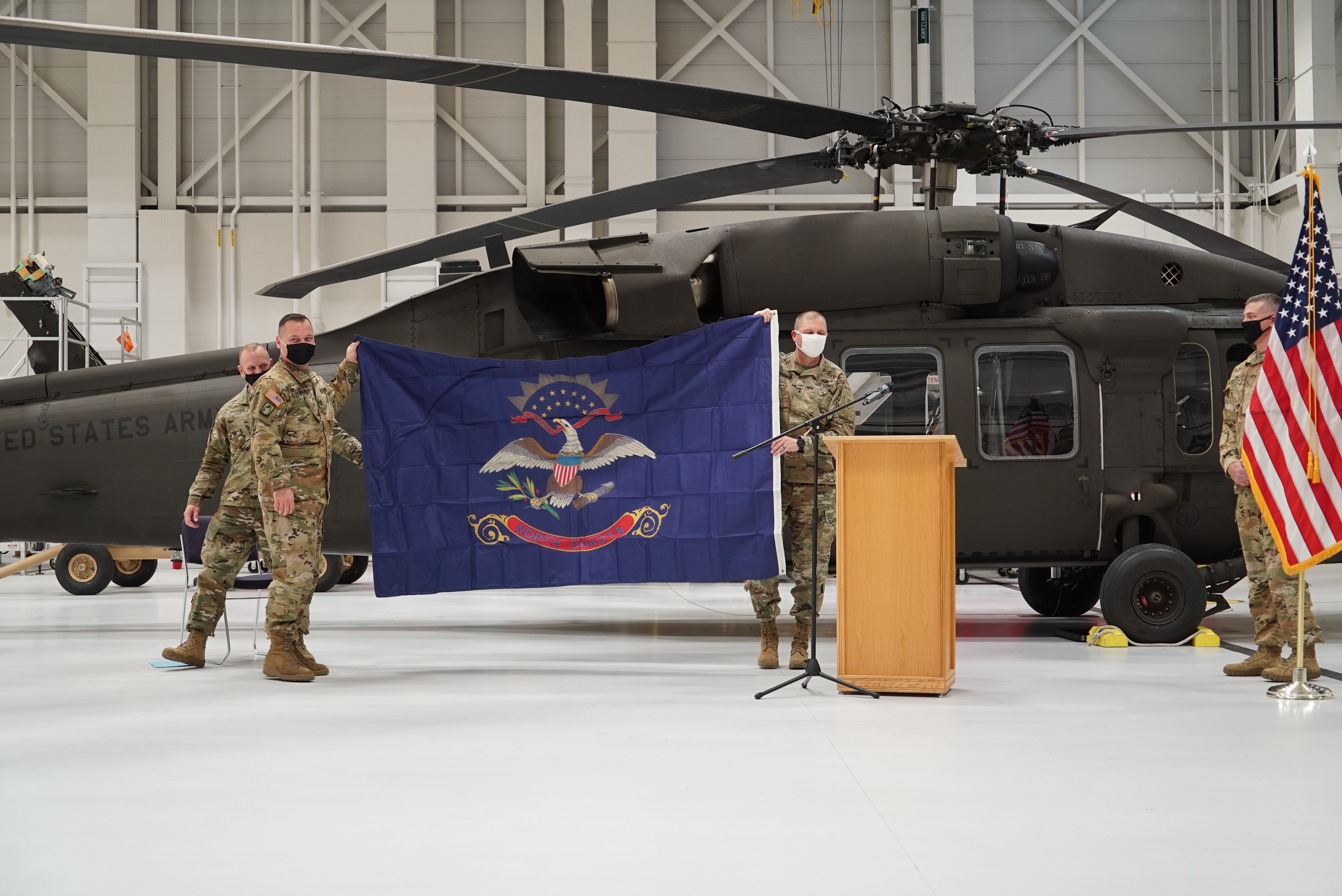 Maj. Gen. Al Dohrmann, N.D. adjutant general, hosted a sendoff ceremony for Company C, 2nd Battalion, 285th Aviation Regiment, at the N.D. National Guard's Army Aviation Support Facility (AASF) in Bismarck, N.D. on Oct. 25, 2020. About 70 Soldiers will mobilize in early November for duty in the National Capital Region (NCR) for an estimated nine-month mission. The unit will operate ten UH-60 Black Hawk helicopters mission in support of the transport of personnel and light cargo within the NCR area. Due to current COVID-19 precautions, the ceremony was conducted virtually with National Guard senior leaders and staff gathered in the Black Hawk hanger, while the unit's Soldiers were assembled in an adjoining building. Families watched the ceremony from locations of their choosing while Gov. Doug Burgum, U.S. Senators John Hoeven and Kevin Cramer along with U.S. Rep. Kelly Armstrong delivered pre-recorded messages of support.