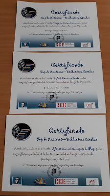 Na Escola José Régio, a distinção dos melhores leitores da Biblioteca Escolar é feita trimestralmente, no final de cada período letivo, atribuindo-se um Certificado e um Prémio (livro) ao melhor leitor do 2º ciclo e ao melhor leitor do 3º ciclo. E este ano não foi exceção, apesar de que no 3º ciclo apenas houve distinção a partir do 2º período, dado o reduzidíssimo número de livros requisitados por alunos do 3º ciclo. Em compensação no 3º período distinguimos 2 alunos que requisitaram o mesmo número de livros. Nestas sessões temo contado sempre com a presença da Diretora do Agrupamento, profª Ana Rute Sanguinho ou de outro elemento da Direção. No corrente ano esperamos conseguir replicar esta prática nas escolas do 1º ciclo com Biblioteca!