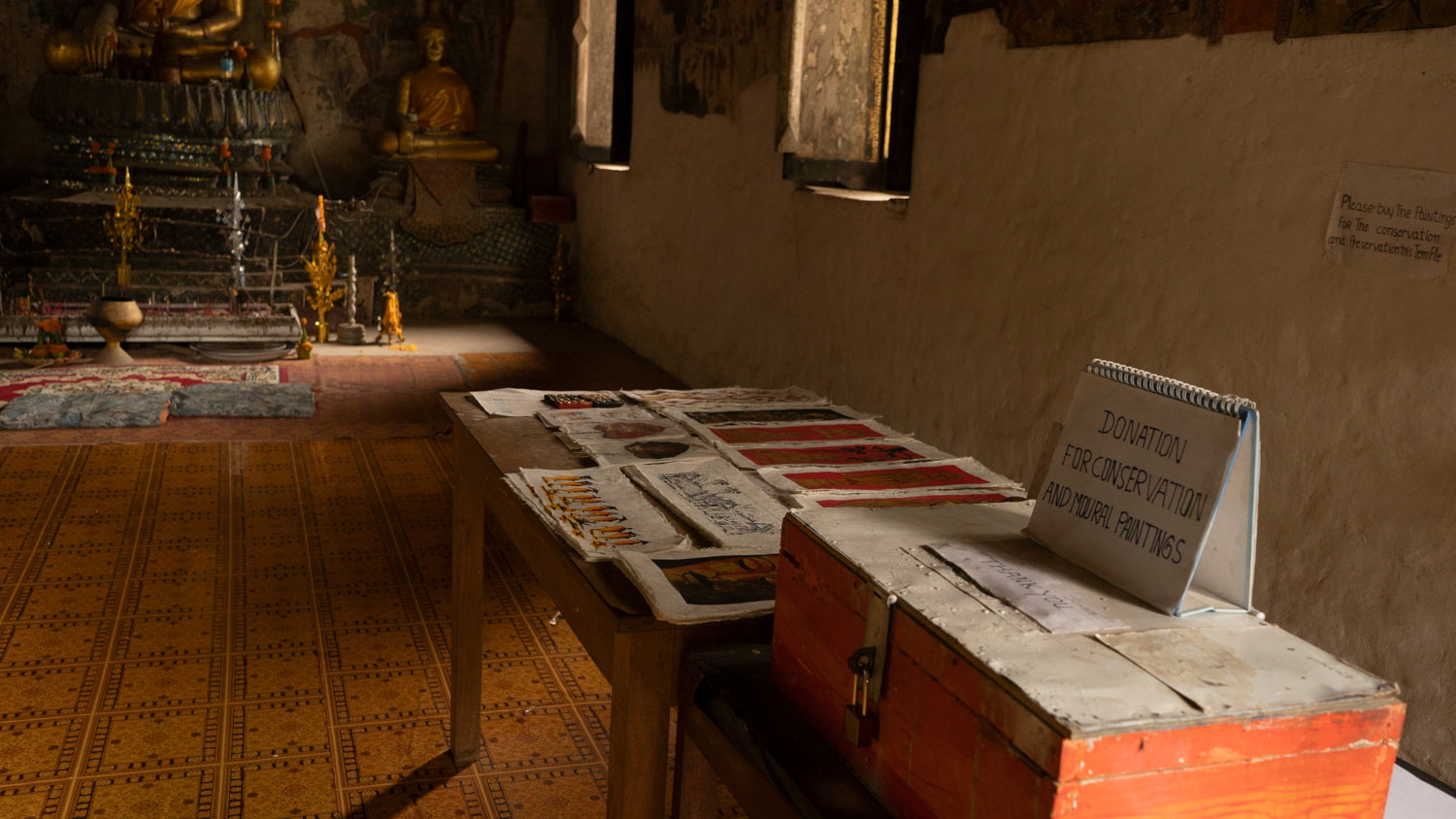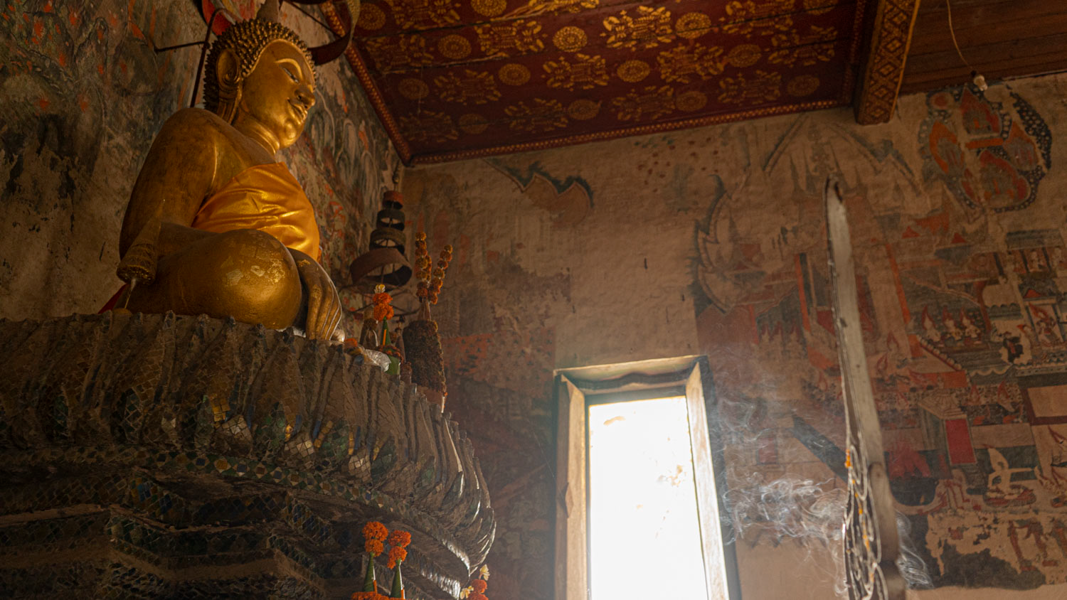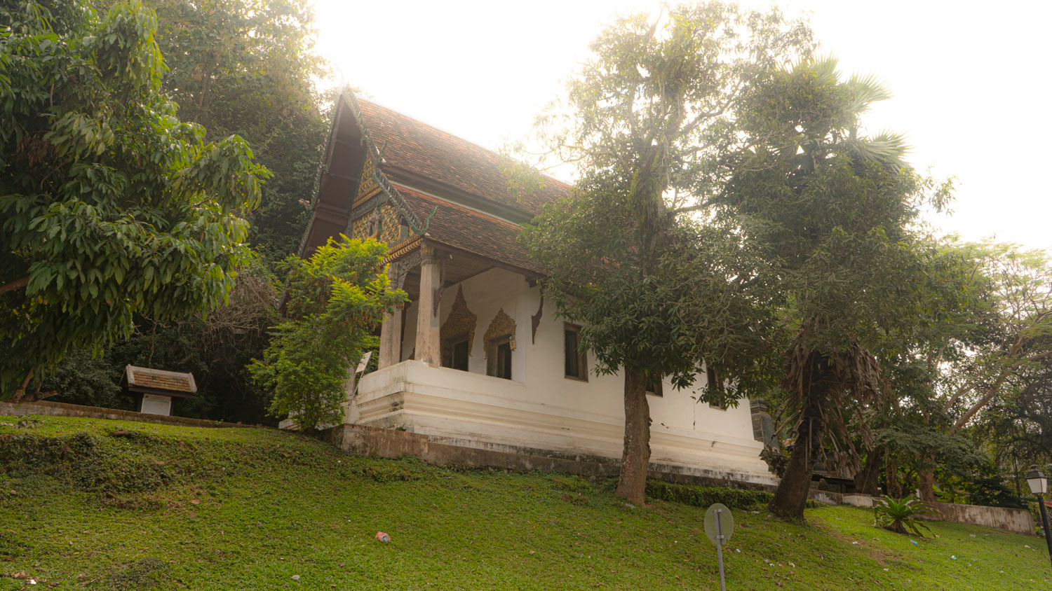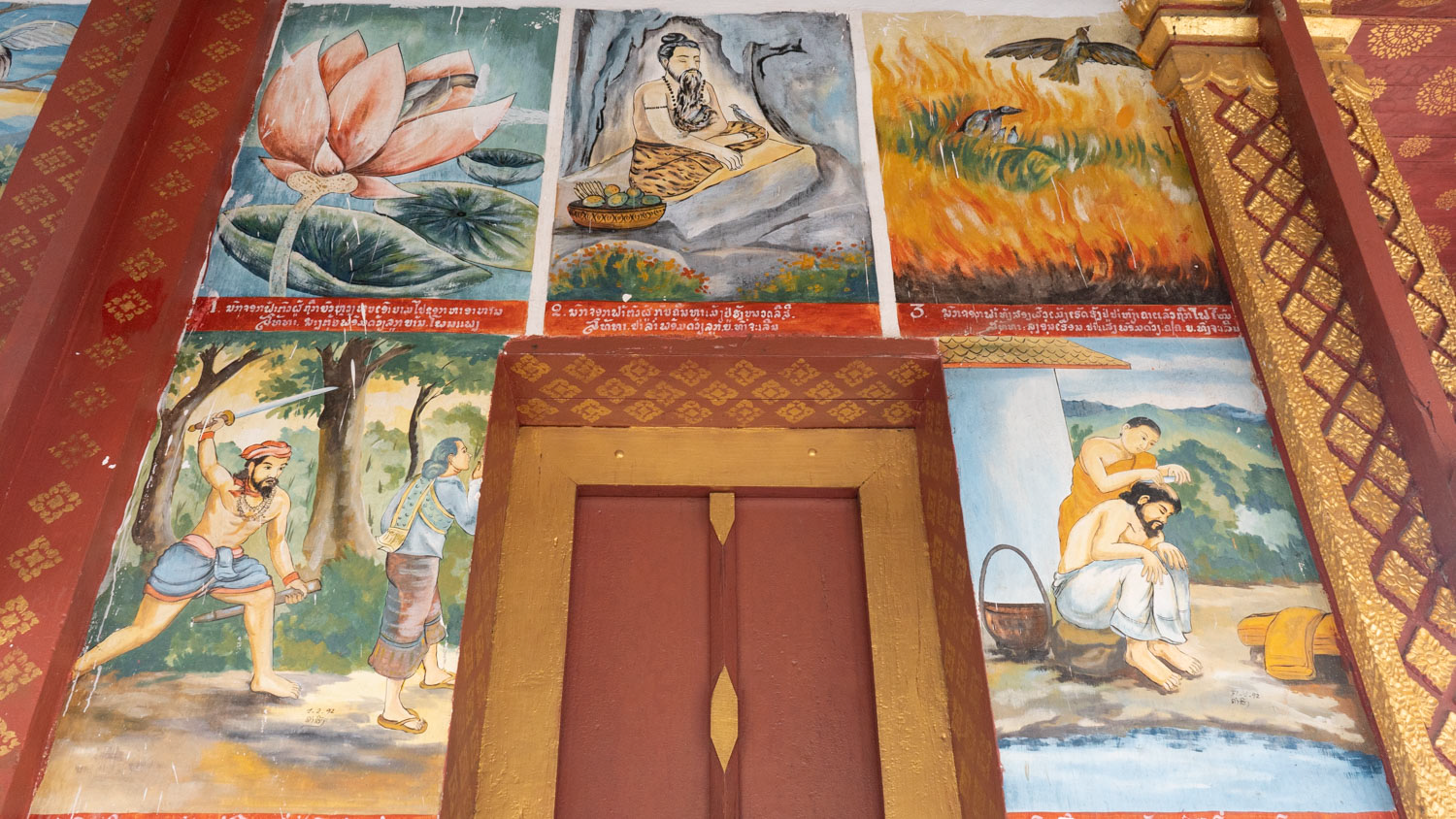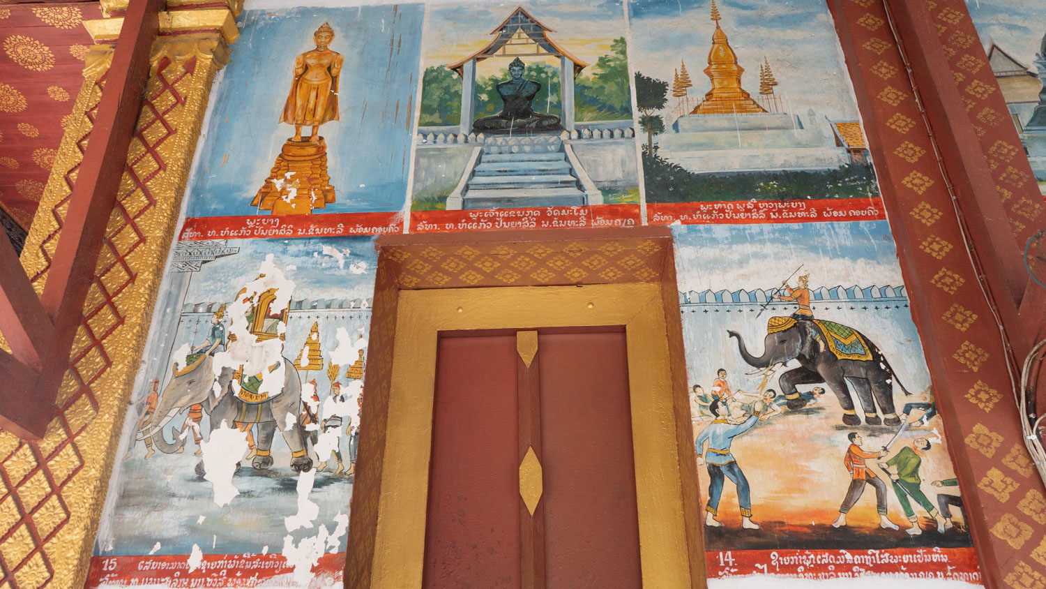 After a short climb up the hill, the visitor is presented with a path that leads to the façade of this small temple. Upon entering there is a table that offers gold-painted bodhi leaves, ink drawings, and prints illustrating images of the Buddha. These are available for free, but one is encouraged to leave a donation. There is a primary seated Buddha flanked by two smaller ones. The murals in this temple, instead of depicting stories of the Buddha, illustrate the legends of Chomphu Patti, a king with magical powers which he used in a malevolent way to control his subjects. The Buddha appealed to the king to show compassion and behave with concern for the people. He refused. A battle ensued and the king lost. This story symbolically represents the need for our kings, rulers and leaders to put the people first. Any powers they may have, even magic, are not of their own creation. Their position and power is given them to use for the betterment of humanity not for their personal gain.