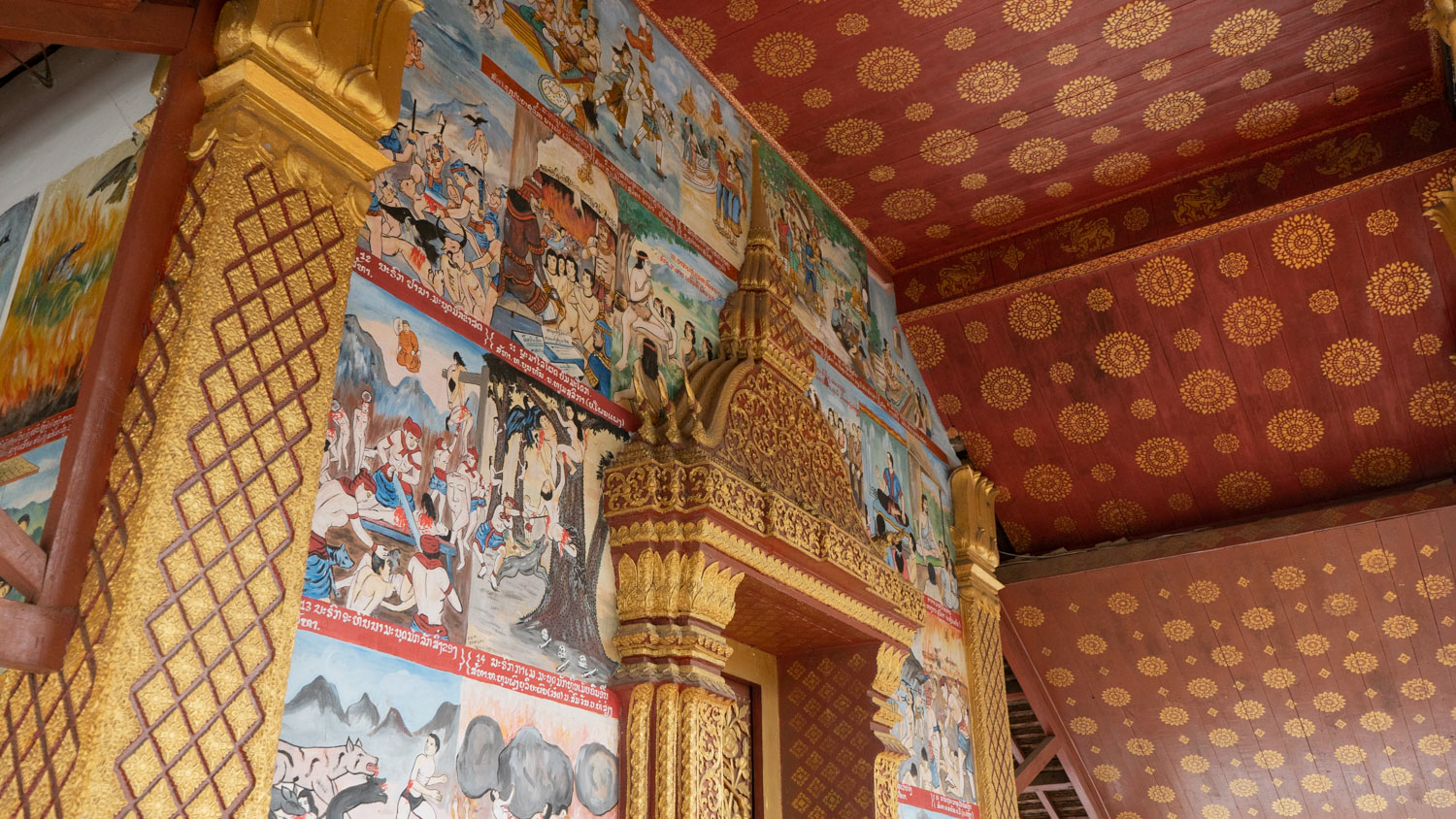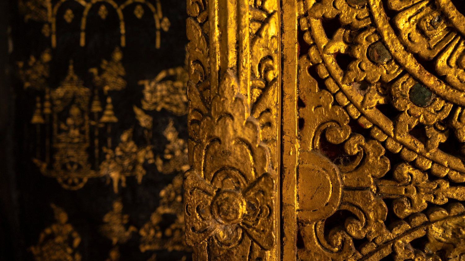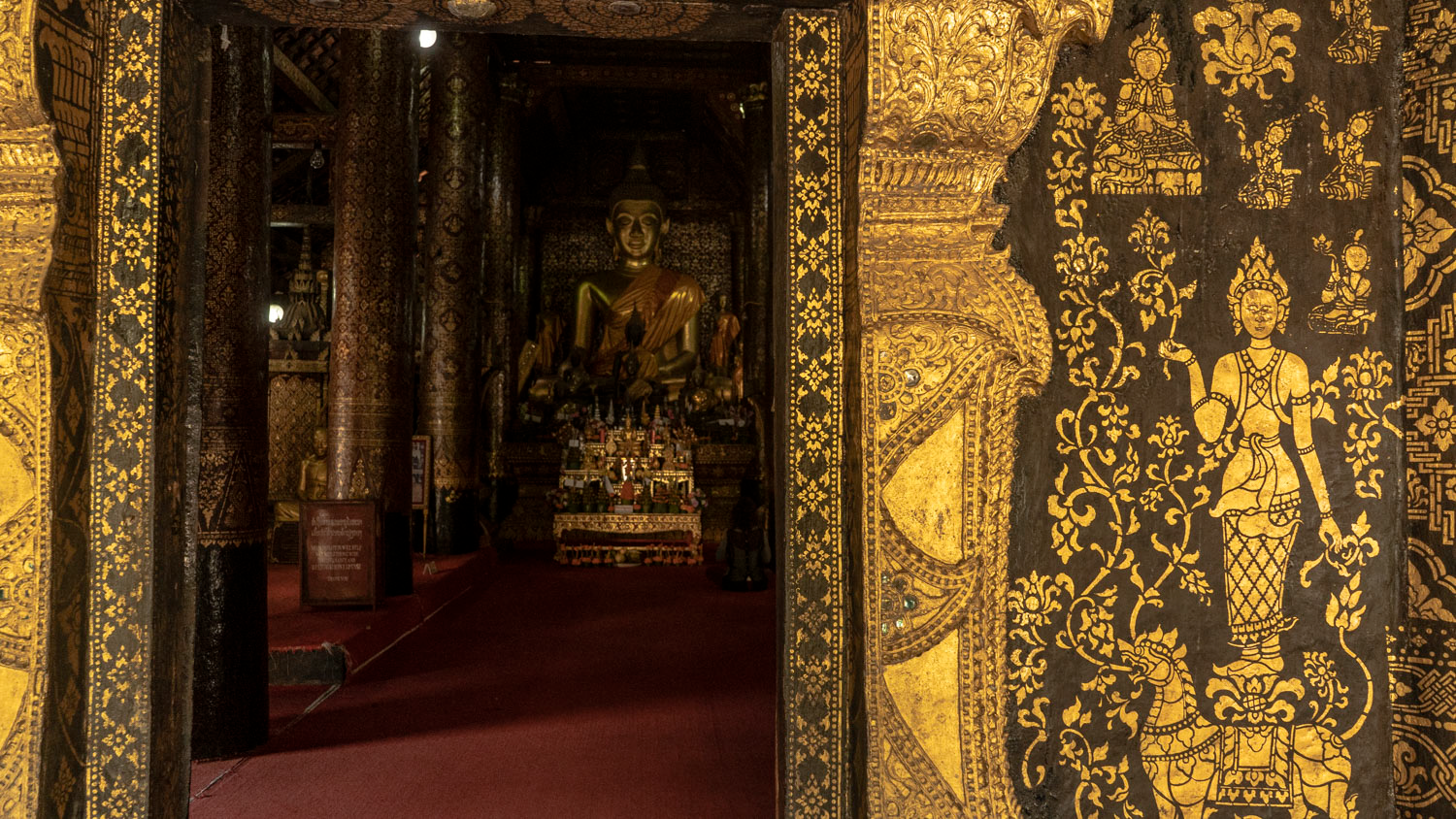 While gold is often used in the creation of Buddha images, and where the devout who visit Southeast Asia's Buddhist temples place gold leaf on the statues of the Buddha, it is at Luang Prabang where we see an immersion into the use of gold throughout. Gold is not a decorative scheme nor is it used to represent power or money. Just the opposite. Gold is worn by the monks and adorns the walls and building of the temples in Luang Prabang to represent how the acquisition of knowledge and insight leads not to power but to humility.