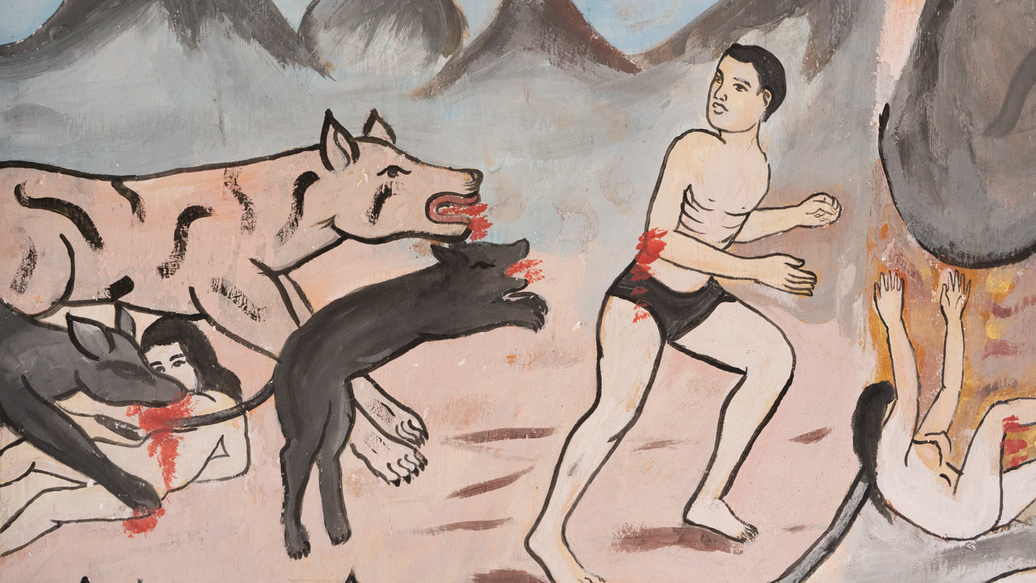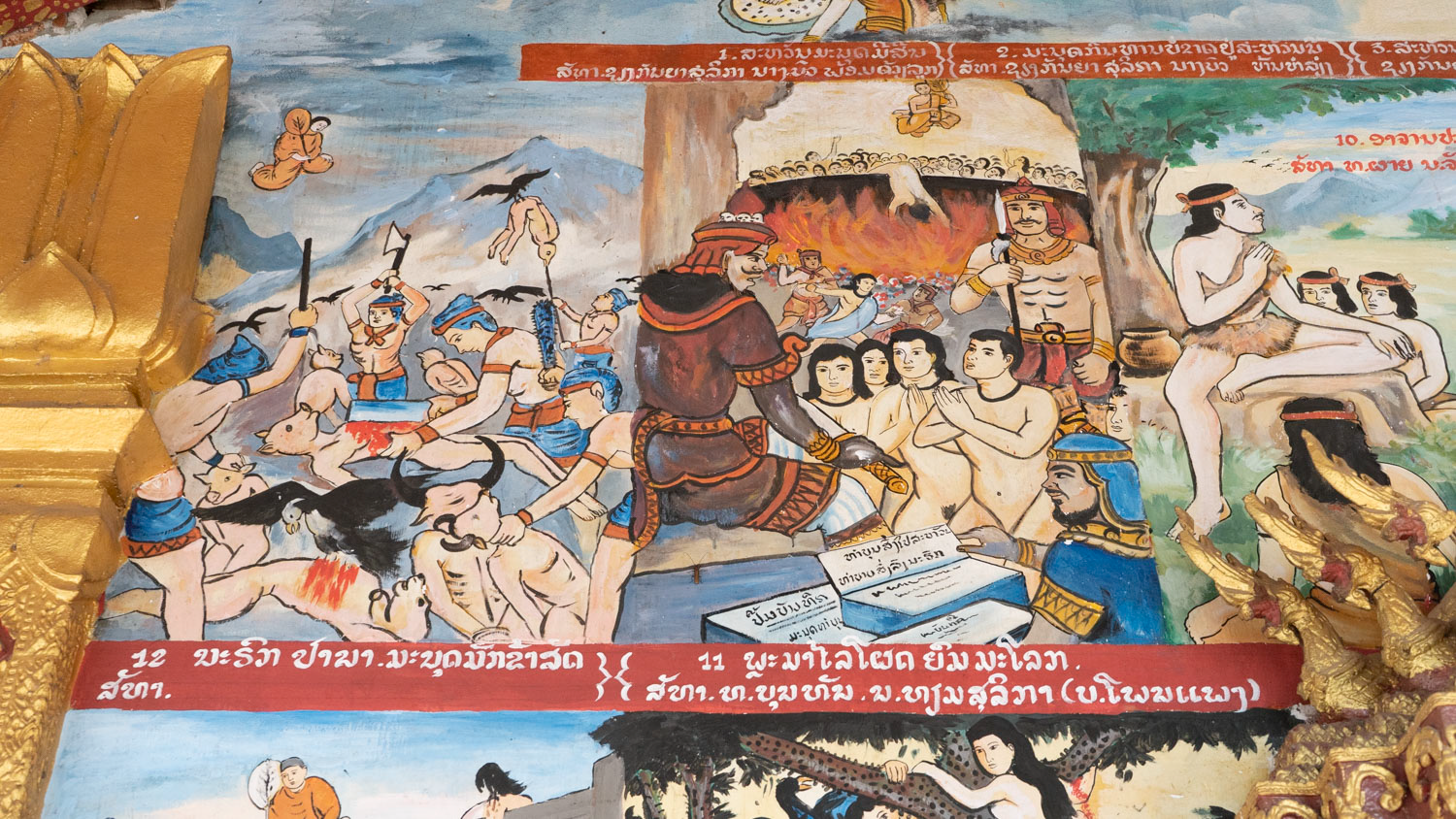 Inside and out of the Hindu and Buddhist temples of Asia, the stories of these religions as well as the ancient tales of heroes and deities are portrayed through murals instead of glass windows. As with the Christian themes seen in Europe, in Asia there are stories which are told and retold through mural art. The Lives of the Buddha, called the Jataka Stories, is an example. Yes, lives, plural, because the man called Gautama Buddha has had many previous incarnations. The Hindu epic, the Ramayana, is frequently represented. There are Buddhist versions of this story as well because the lessons of morality presented in the epic adventures and lives are applicable to all humans. These stories tell of battles between Good and Evil. What varies from one locale to the other might be seen in the application of artistic technique, as well as the methods and quality of the representation. In the temples of Luang Prabang, this also varies. The murals below illustrate episodes of war as told in the Lao version of the Ramayana. Also depicted from one of the town's temples are scenes of the Hindu/Buddhist hell. Not considered an actual place, their understanding of hell is a spiritual malaise that one might experience in this life, not the "here-after." It depicts the condition of the cluttered and unenlightened mind, devoid of knowledge and insight.