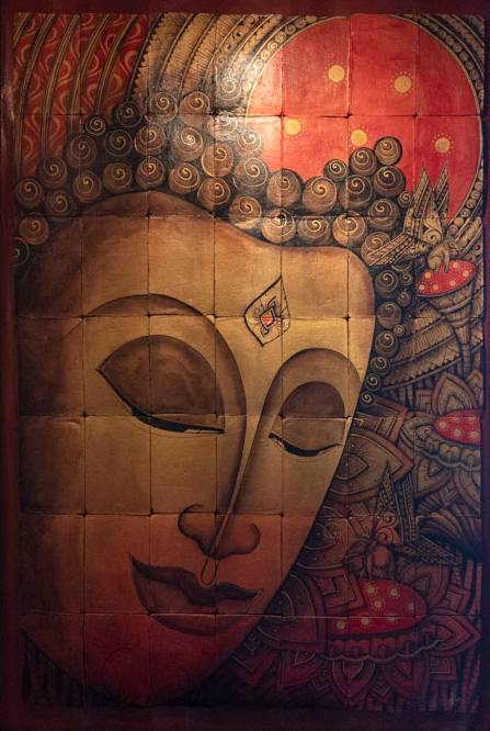 In a town that attracts more tourists than art collectors, such as Luang Prabang, it is common to see art in the local galleries that tend to favor the tastes, budget and portability of the traveler. However, in my experience, I occasionally find work that is not stylistically derivative and that serves more than a decorative purpose. One such artist who explores Buddhist themes, with a nod to the feminine aspects of Buddhism, is the Lao painter Mankone. His paintings are created on a ground of handmade paper or on individual ceramic tiles which are then assembled together to form the full painting. (Artwork photographed by Fred Sigman with the permission of the Kop Noi Gallery.)