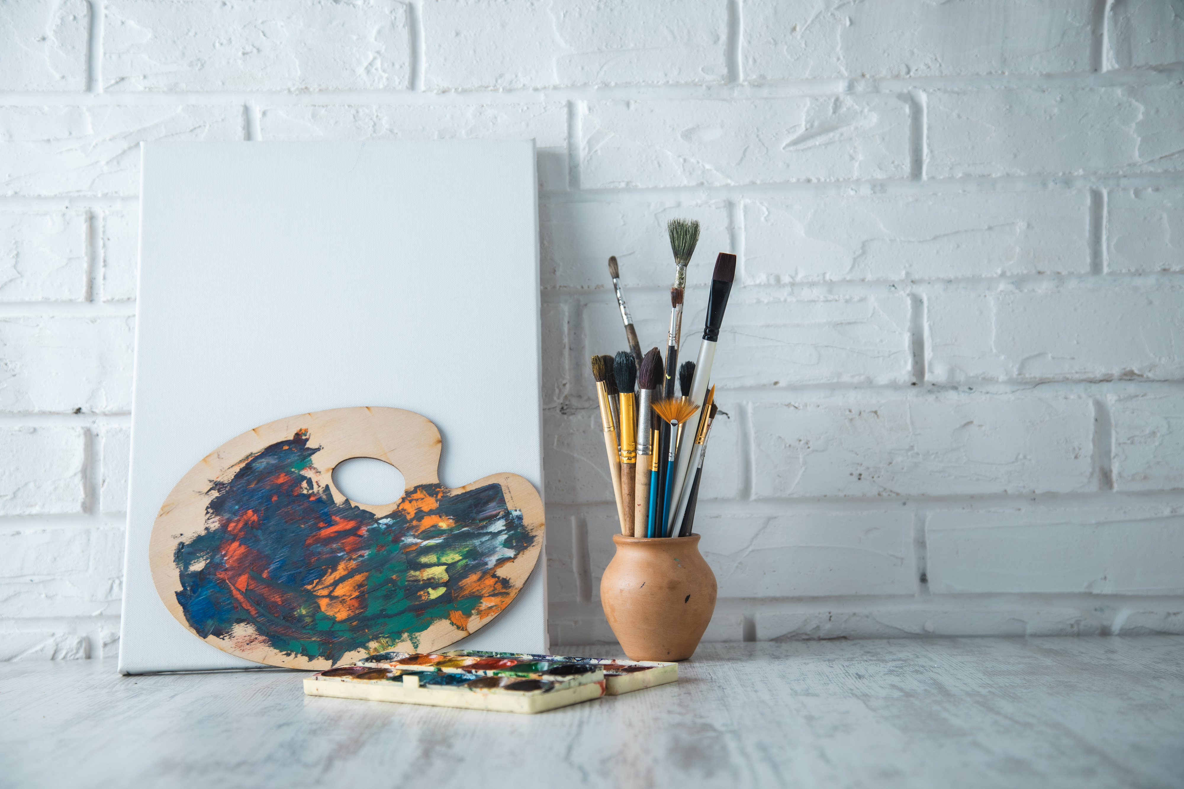 Created with images by ronniechua - "Education Concept With Apple on Books and Chalkboard Background" • ARAMYAN - "brushes with canvas on brick wall background"