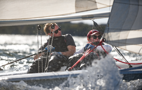 Racing began on Saturday, and the wind was howling. With a steady breeze between 15 and 17 knots, Seamus spent the entire day hiking. Four races were scheduled, so their small boat was packed with as many snacks as possible. After a rough first race due to a rigging error, they pulled together three solid races to finish the day strong.