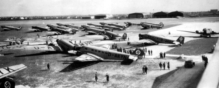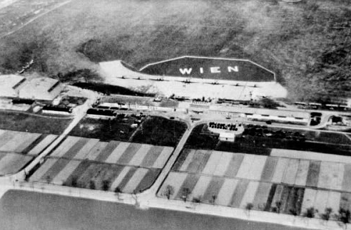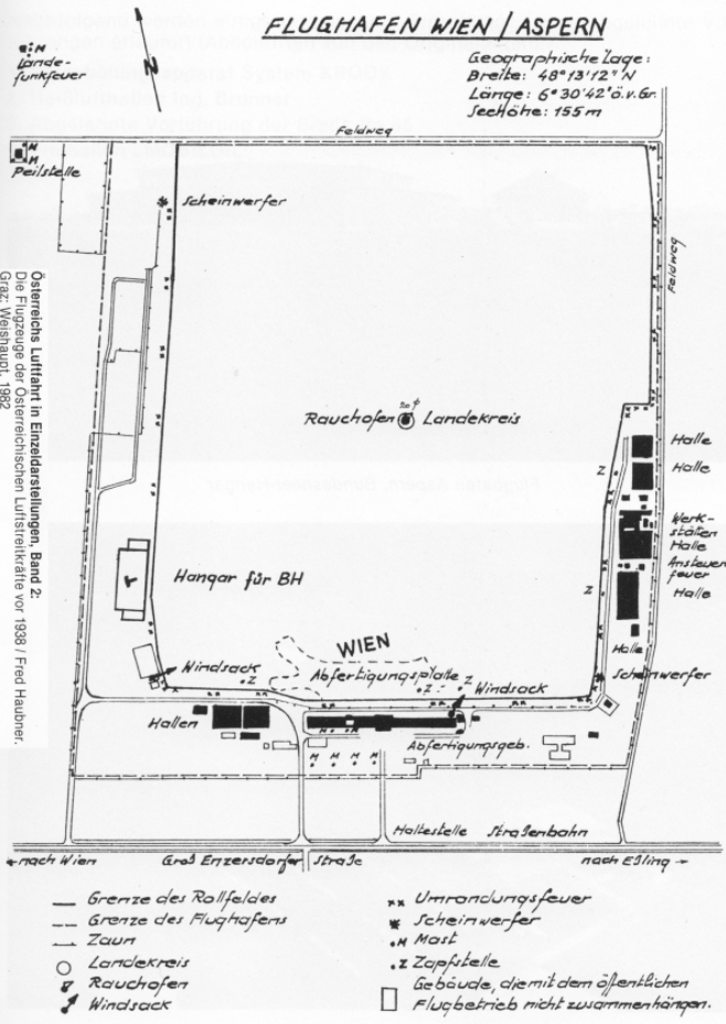 - 1938 - Deutsche Truppen landen: Wenige Jahre später, 1937, demonstrierten österreichische Militärpiloten auf einem Flugtag, der große Scharen von Besuchern anzog, ihr Können der Öffentlichkeit. Doch nur ein Jahr später erlosch der zivile Flugbetrieb erneut, als am 12. März 1938 hunderte Maschinen der Deutschen Luftwaffe in Wien Aspern landeten. Der Platz wurde mit Bunkeranlagen, Splitterschutzwällen, Flakstellungen und Hangars intensiv ausgebaut und diente bis Kriegsende der Luftwaffe als Stützpunkt, auf dem unter anderem die Blindflugschulung angehender Flugzeugführer erfolgte. Zahlreiche Reste von Bunkern, Stacheldrahtverhauen und Sockeln der ehemaligen Flakstellungen in der näheren Umgebung des ehemaligen Flugplatzes, zeugen noch heute von dieser Zeit. Glücklicherweise blieb der Ortskern von Aspern von den Bombenangriffen der Alliierten im 2. Weltkrieg, deren Hauptziele der Luftwaffenstützpunkt auf dem Flughafen sowie die Raffinerie in der Lobau waren, weitgehend verschont.