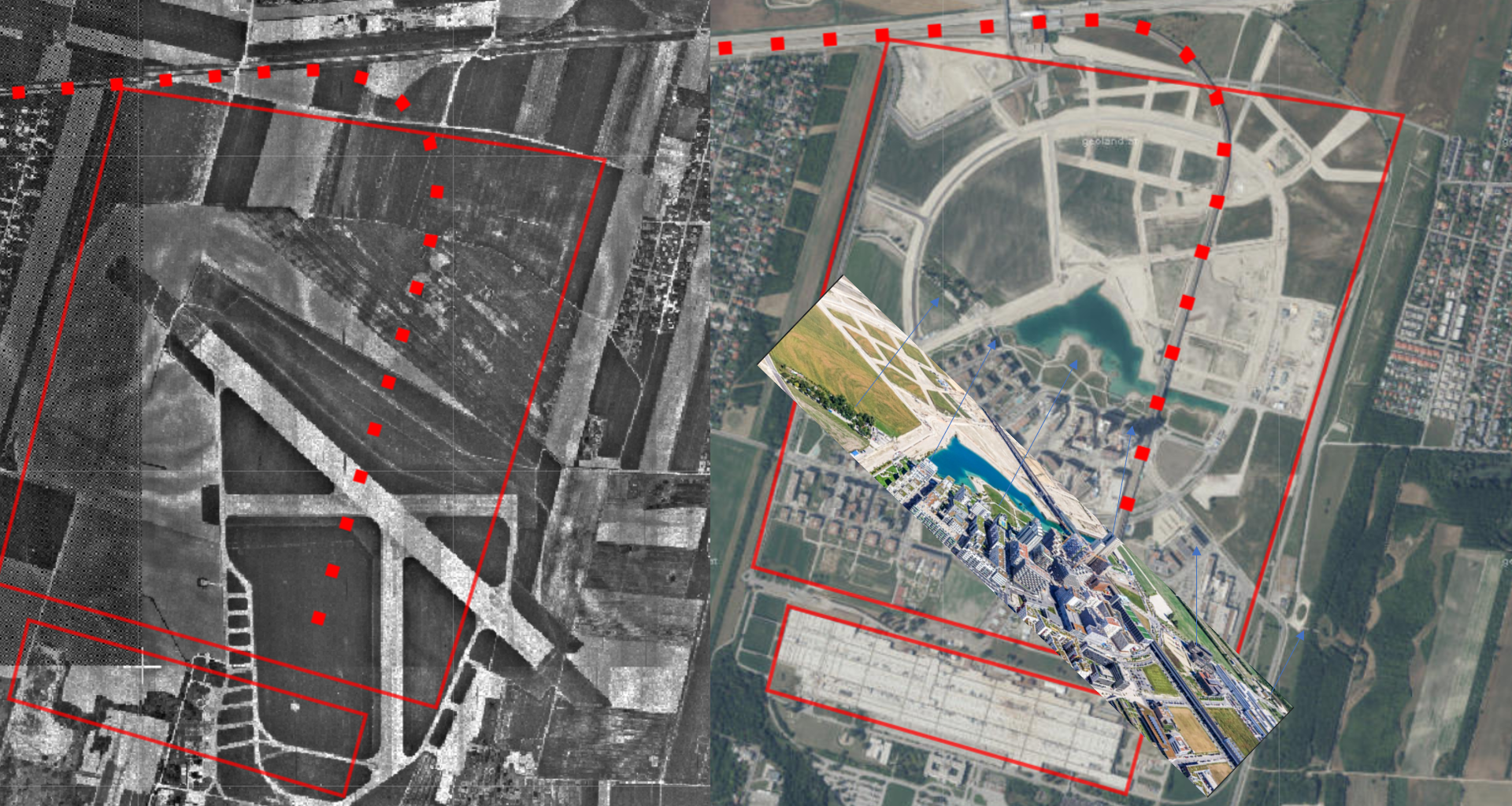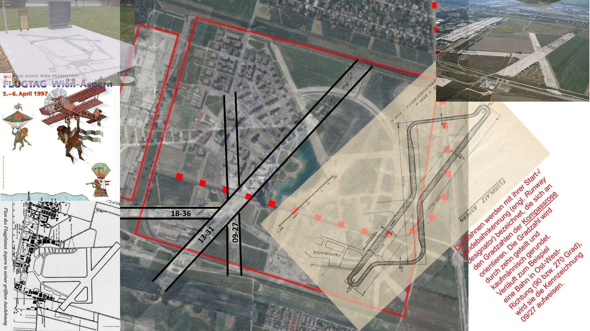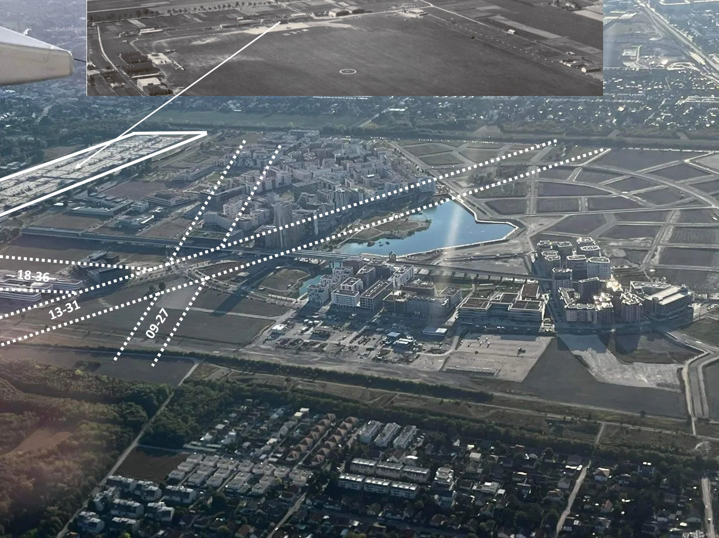 - Piste 09-27 verläuft von Osten Richtung Hanna Ahrendt Platz heute und in Verlängerung die heutige Maria-Tusch-Strasse bis "Alte Schanzen"