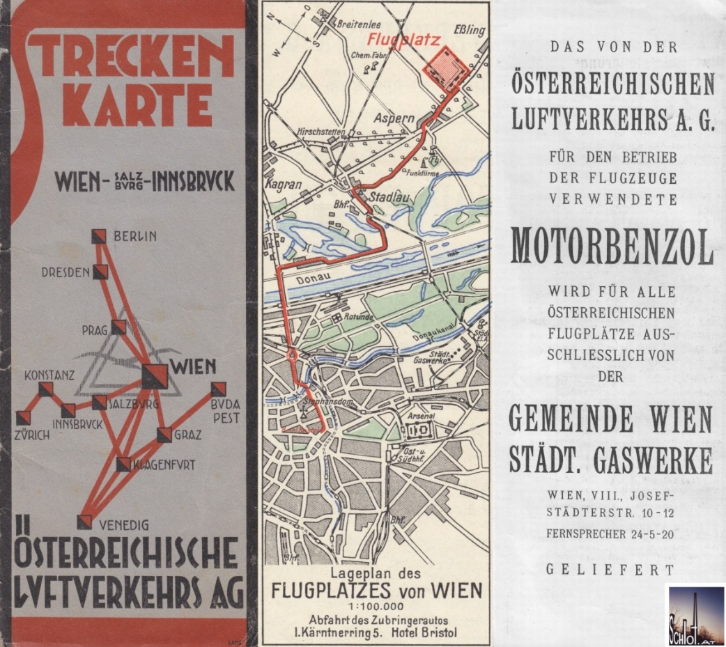 - 1923 wurde die Österreichische Luftverkehrs AG (kurz ÖLAG), also die erste Fluglinie der Republik Österreich, gegründet. Wien-Aspern war der Heimatflughafen. Am 14.05.1923 fand der erste Flug der ÖLAG von München nach Wien statt. Im Laufe der späten 1920er Jahre wurde ein Streckennetz etabliert, das unter anderem Berlin, Budapest, Mailand [4] sowie Dresden, Prag, Zürich, Venedig und mehrere österreichische Großstädte beinhaltete.