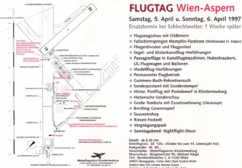 Heftiger Seitenwind ließ die Landung auf der ohnedies sehr kurzen Piste 36 beim Jubiläumsflugtag 1997 zur besonderen Herausforderung werden. Trotz schlechtesten Wetters, Wind und Regen, besuchten mehr als 5.000 Personen den Flugtag, welcher auch von der Klosterneuburger Feuerwehr, dem Bundesheer und Gewerbetreibenden mitgestaltet wurde. Dieser Veranstaltung fand wegen des Schlechtwetters sogar an 2 Wochenenden hintereinander statt, ein wahrer Augenschmaus für Flugbegeisterte. Nach Beendigung dieser beiden Wochenenden jedoch schien es ...