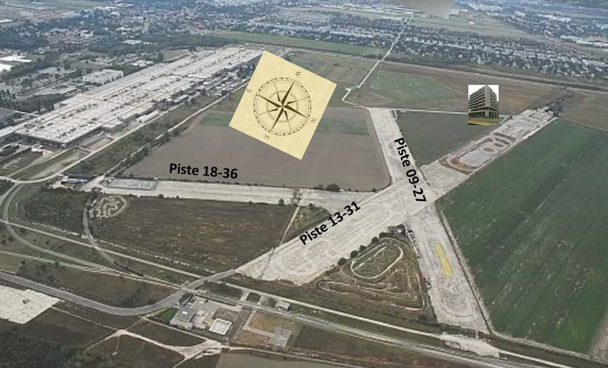 - Piste 18-36: verläuft zum Flughafengebäude (heute Stellantis resp. früher Opel)