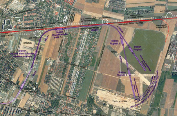 - Pist 13-31: verläuft vom ehemaligen Christopherus (Gedenkwaldeingang) über das ehemalige ARBÖ-Gelände via die ehemalige tBASE (grüne Oase) gen Osten