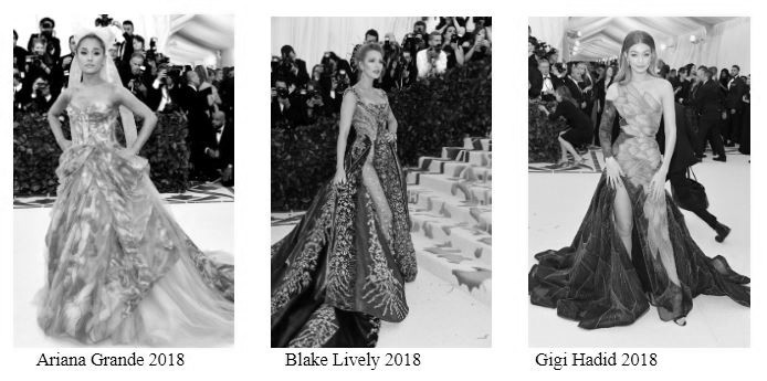 Above we can gather the essence of the Metropolitan’s Costume Institute exhibit through the fashion worn by these three women. Grande’s Vera Wang dress, complete with the religious iconography displayed on the ceiling of the sistine chapel represents the exhibit title well. Lively’s Versace look was topped off with a golden halo while her counterpart, Gigi Hadid, also wearing Versace, dressed in an angel wing inspired gown.