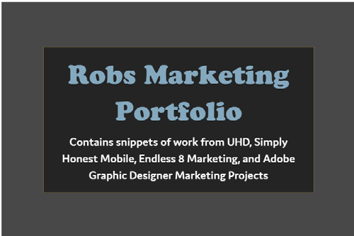 Robs Marketing Portfolio Contains snippets of work from UHD, Simply Honest Mobile, Endless 8 Marketing, and Adobe Graphic Designer Marketing Projects