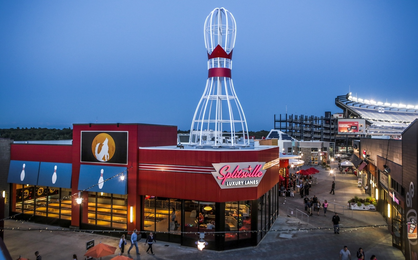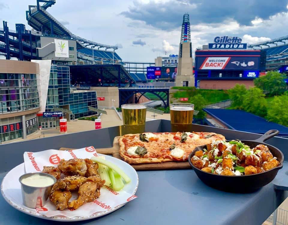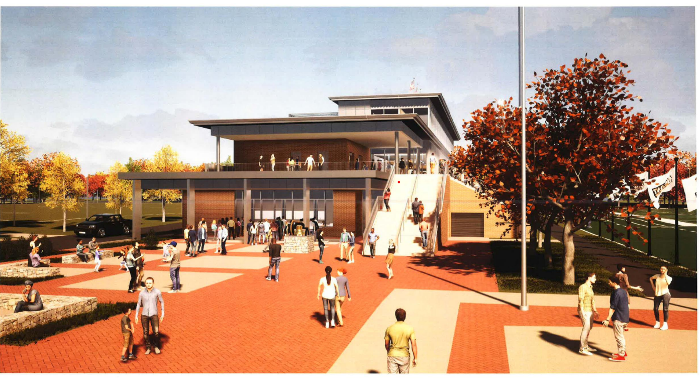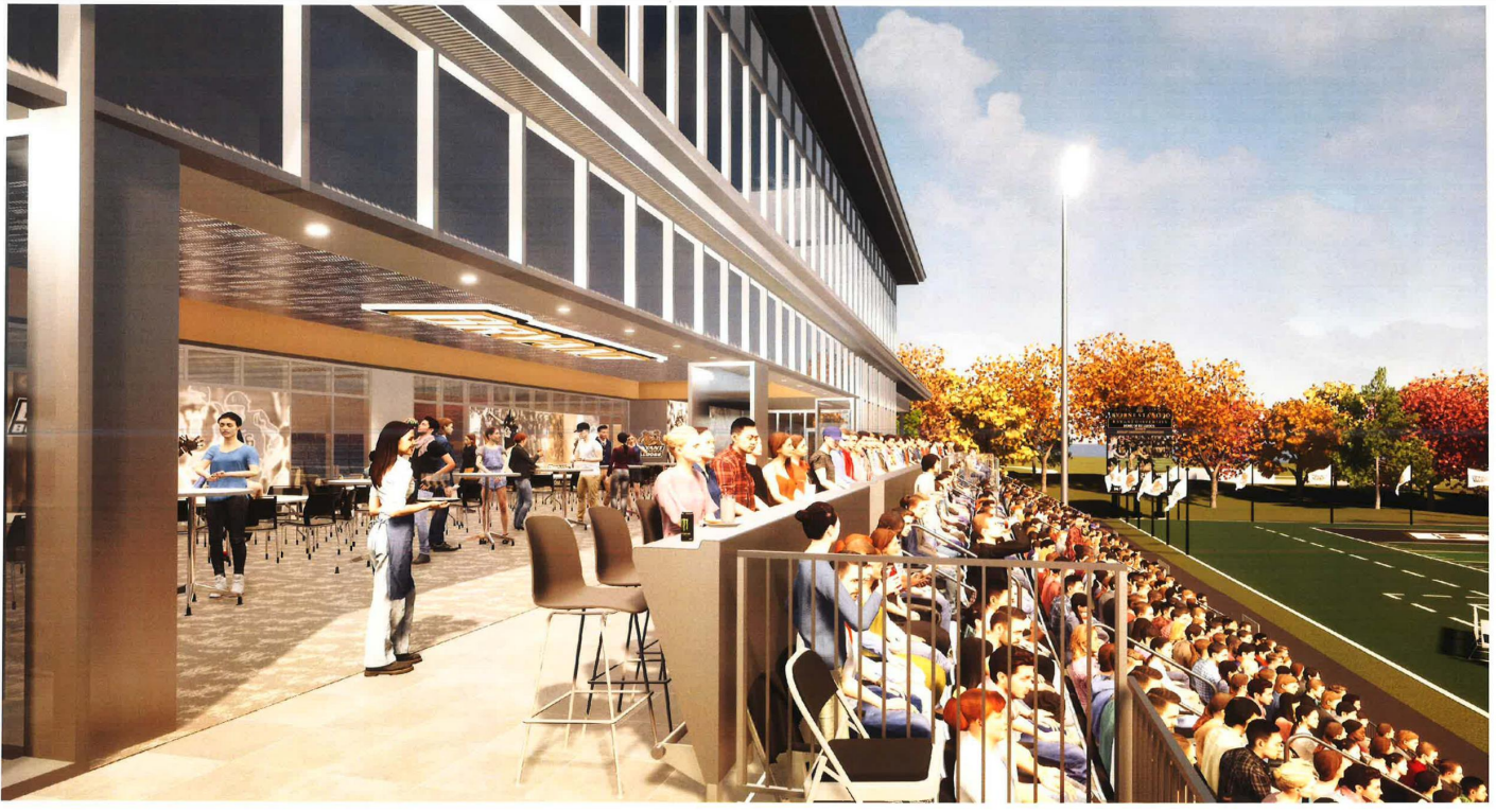 The glass-enclosed structure sits just beyond the end zone of Beirne Stadium and features a field-level outdoor viewing terrace.