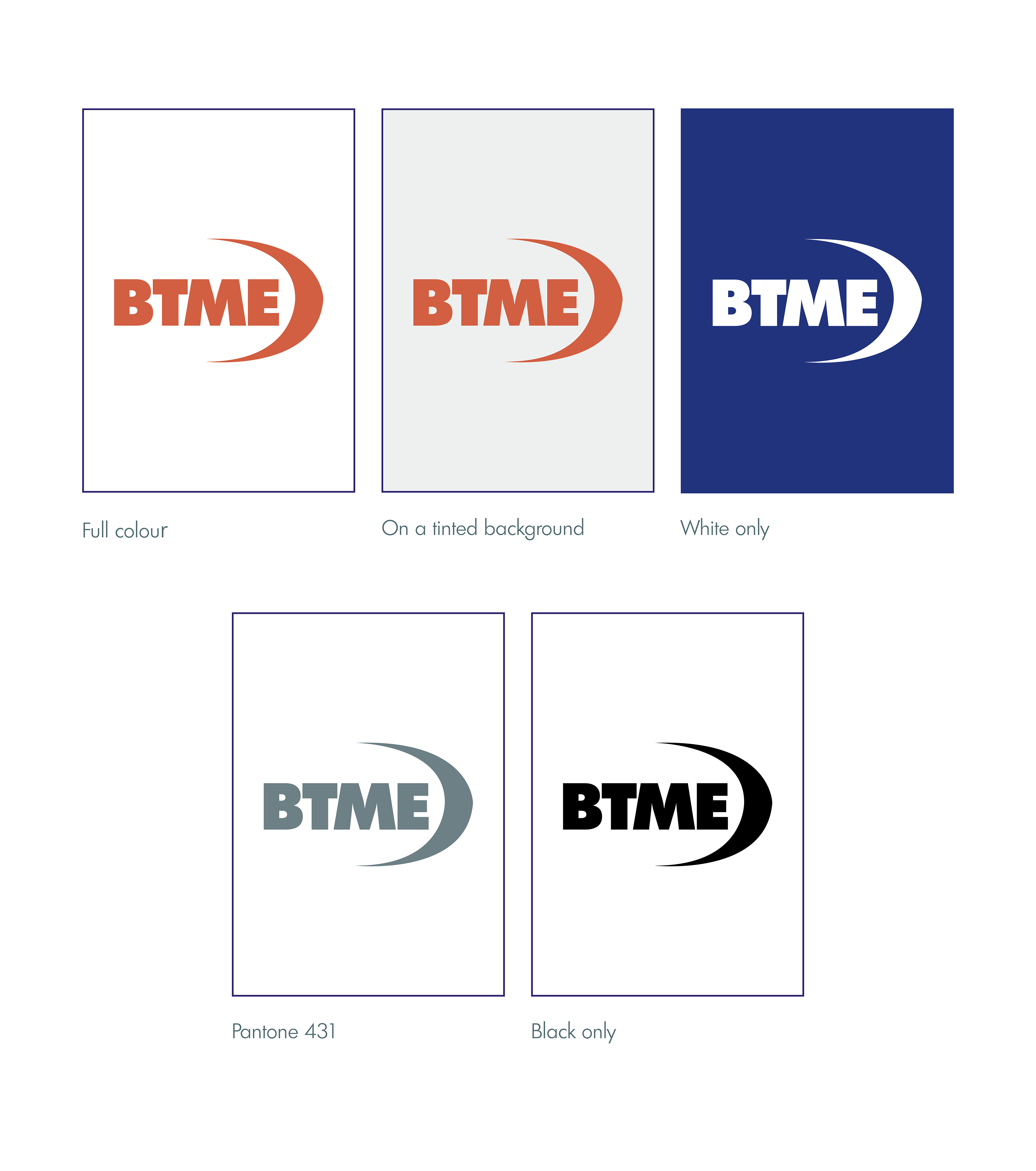 The core BTME logo and multi-brand lockups are available in a range of colour choices for specific applications.