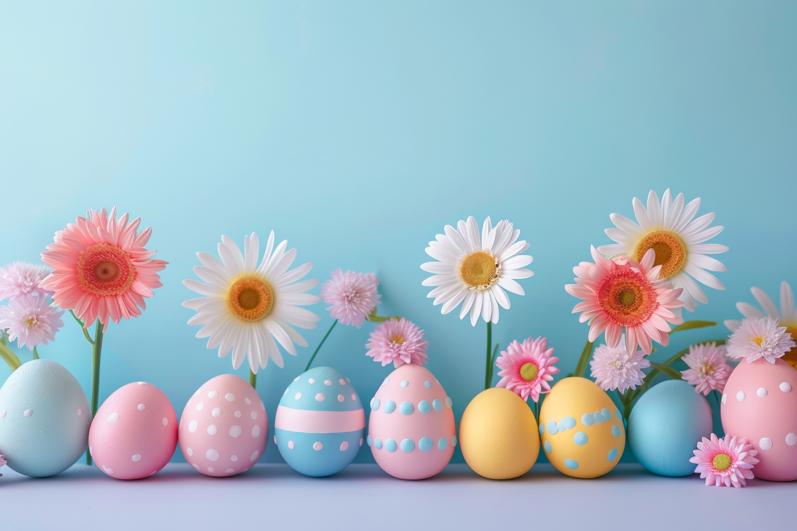 Created with images by tatomm - "close up of calendar on the purple background, planning for business meeting or travel planning concept" • HN Works - "Clover leaves form a frame on a white background" • iDoPixBox - "A colorful arrangement of eggs and flowers on a blue background"
