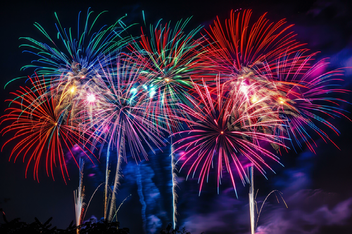 Created with images by anatolir - "Colorful fireworks bursting in a clear night sky, celebrating a festive occasion" • obpia30 - "clock time alarm clock"