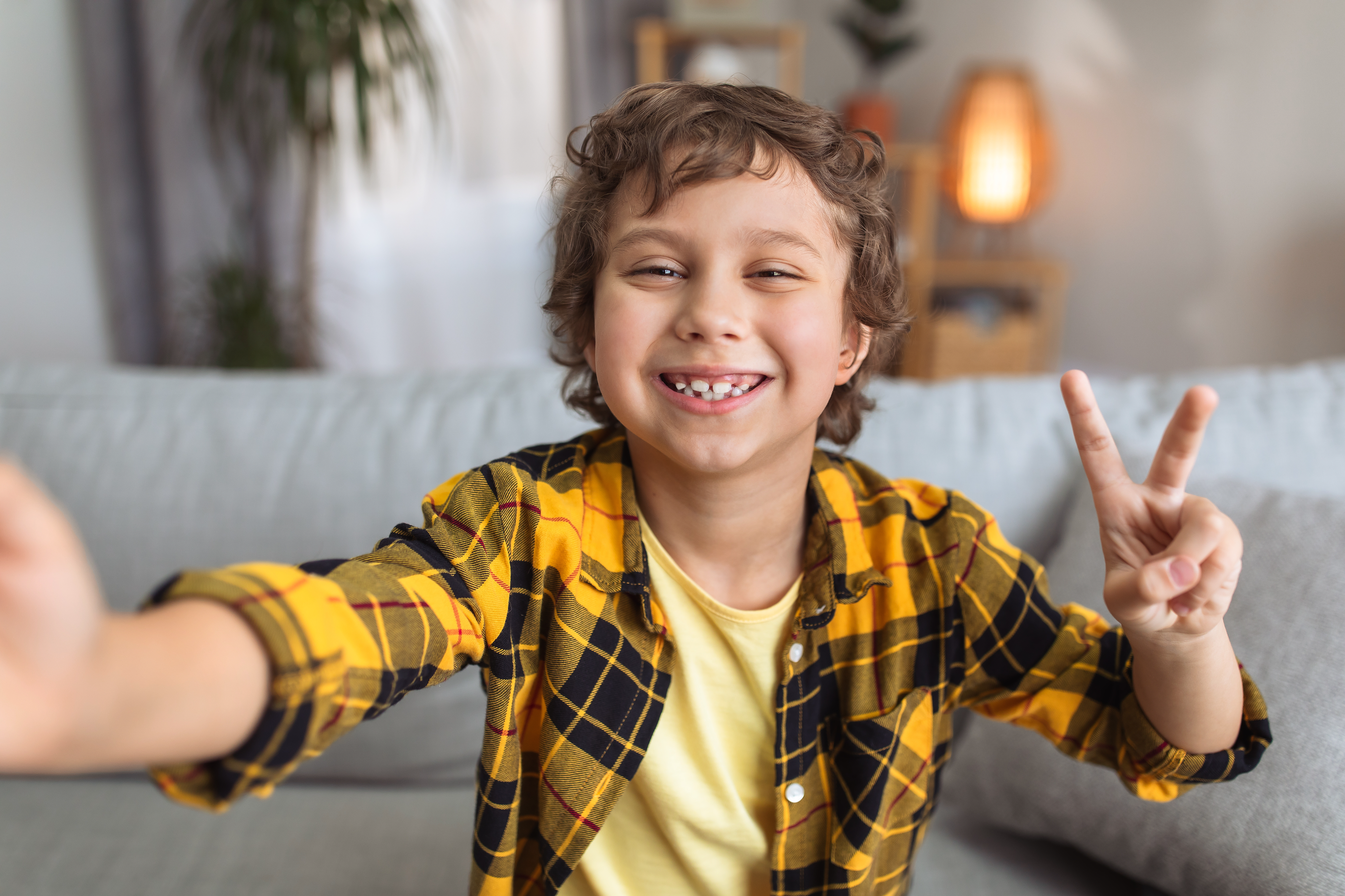 Created with images by Sunny studio - "Happy child playing at home" • kegfire - "Stylish kid pointing with forefinger at camera" • Prostock-studio - "Selfie time. Camera pov portrait of happy little boy blogger making photo, smiling to camera and showing peace gesture" • InfiniteFlow - "3D rendering artificial intelligence AI research of robot and cyborg development for future of people living. Digital data mining and machine learning technology design for computer brain."