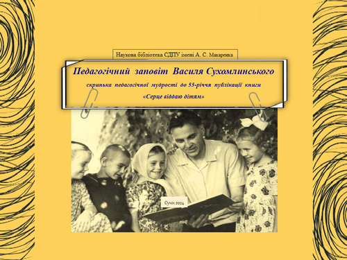 Василь Олександрович Сухомлинський дуже любив дітей, тому і став педагогом. Це справді людина з полум’яним серцем, видатний педагог сучасності. 35 років свого життя він віддав школі. Сухомлинський – заслужений вчитель України, лауреат Державної премії імені Т. Г. Шевченка. З його ім’ям пов’язані збагачення і піднесення педагогічної науки ХХ століття. Велика, самобутня спадщина вченого з плином часу привертає все більше уваги.