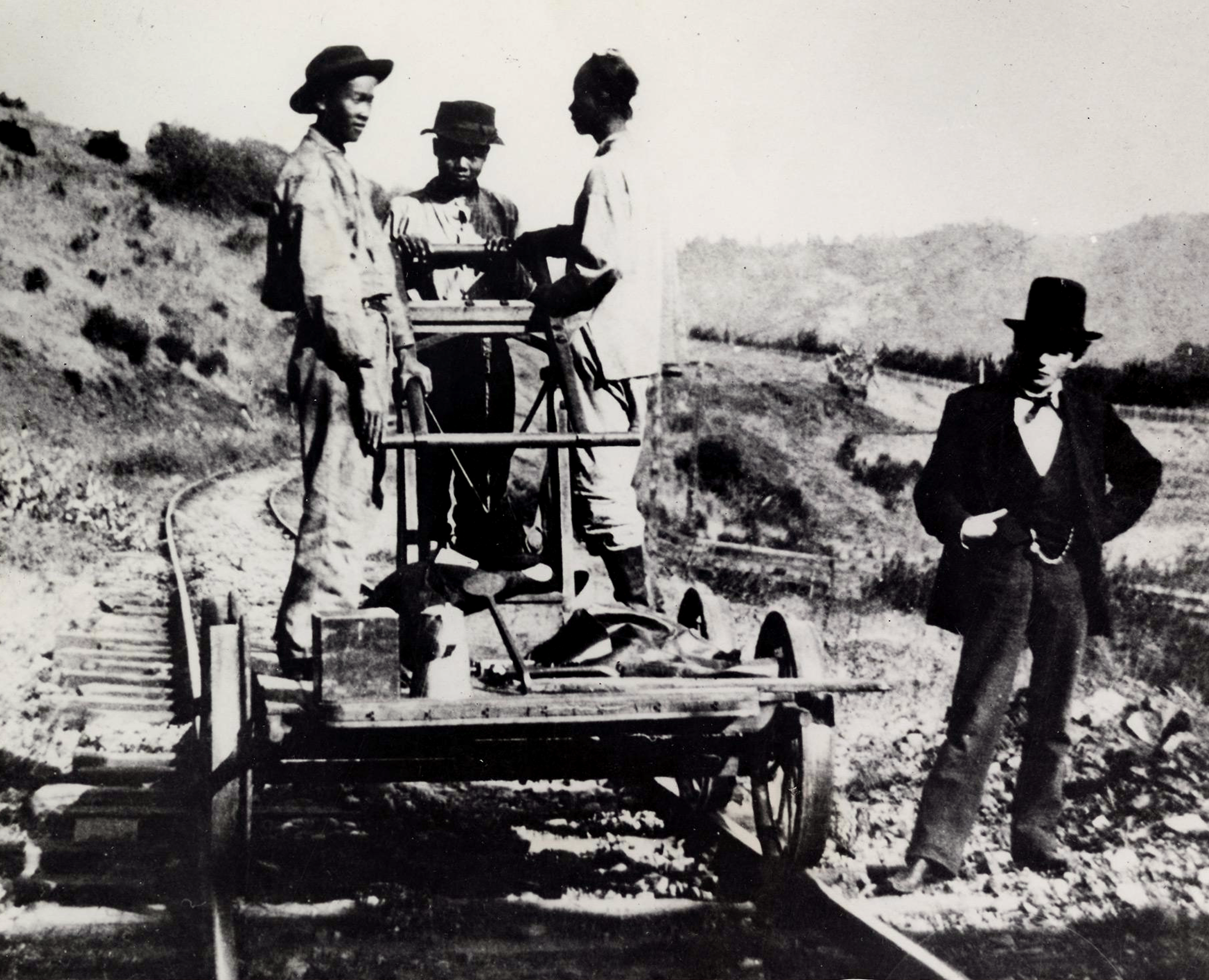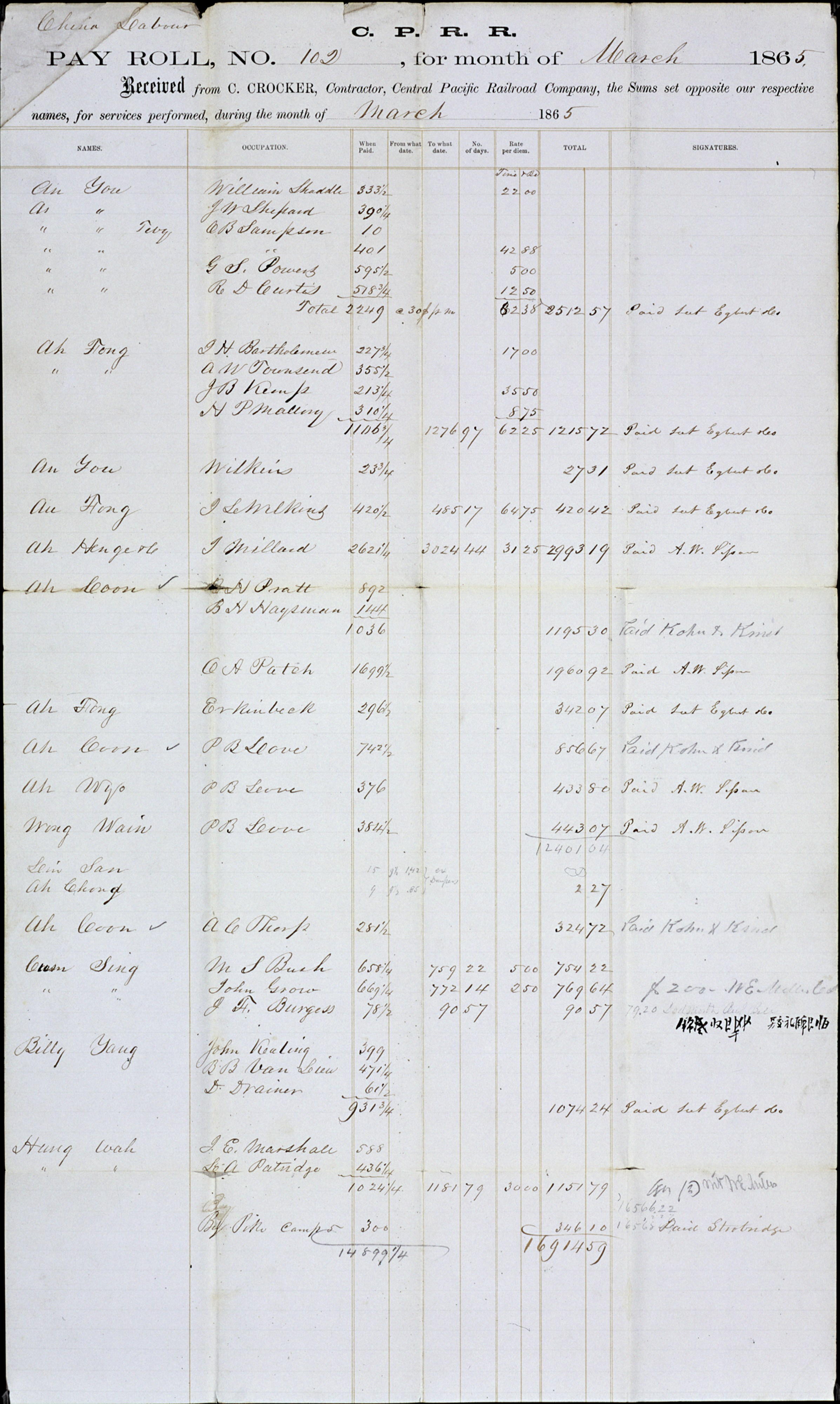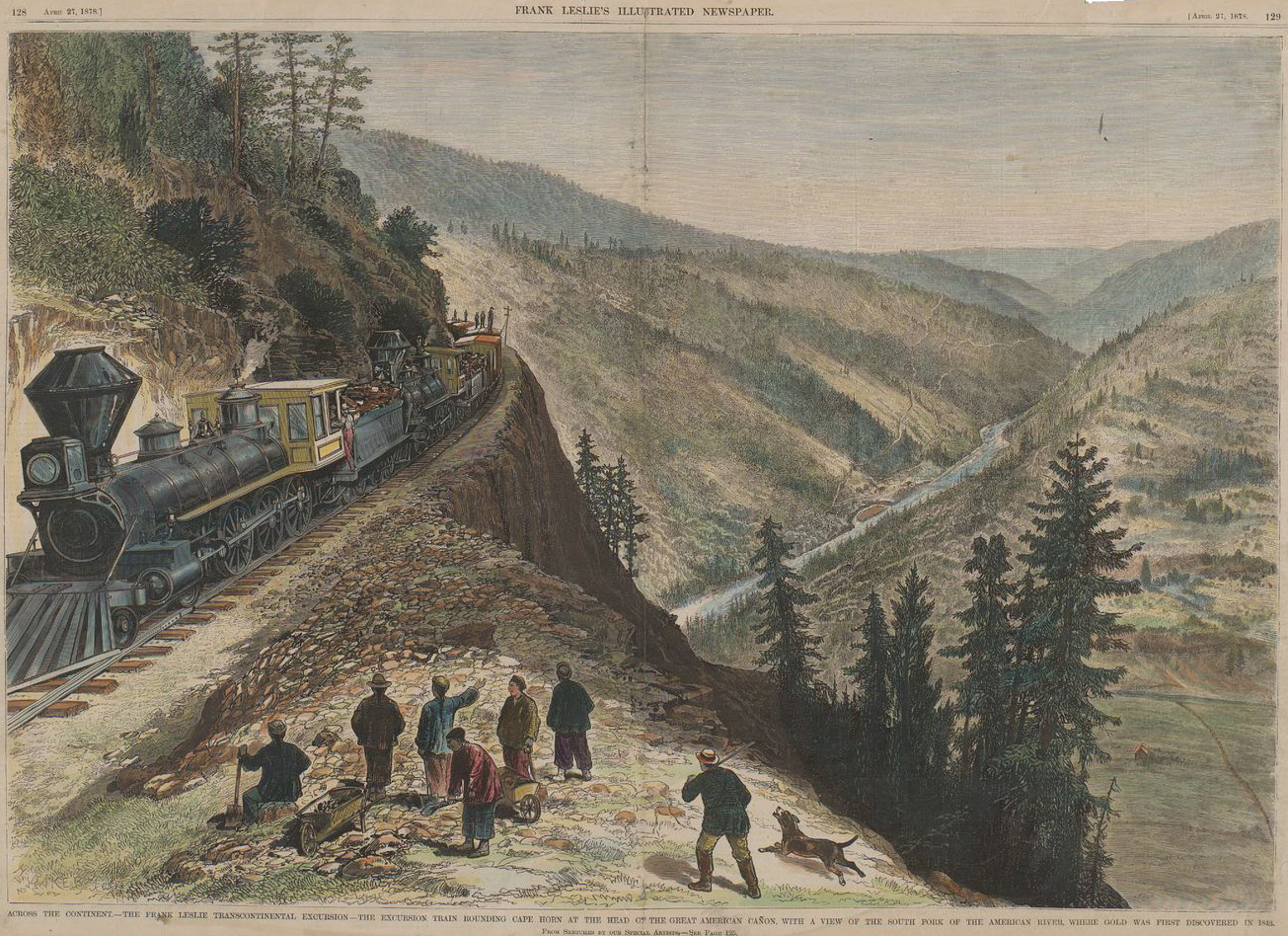 Los trabajadores ferroviarios chinos fueron vitales para la finalización del Ferrocarril Transcontinental. El Ferrocarril Pacífico Central (CPRR) contrató a más de 10,000 hombres chinos para construir un ferrocarril sobre el difícil terreno de Sierra Nevada. En 1868, más del 90% de la fuerza laboral de la CPRR estaba formada por inmigrantes chinos.