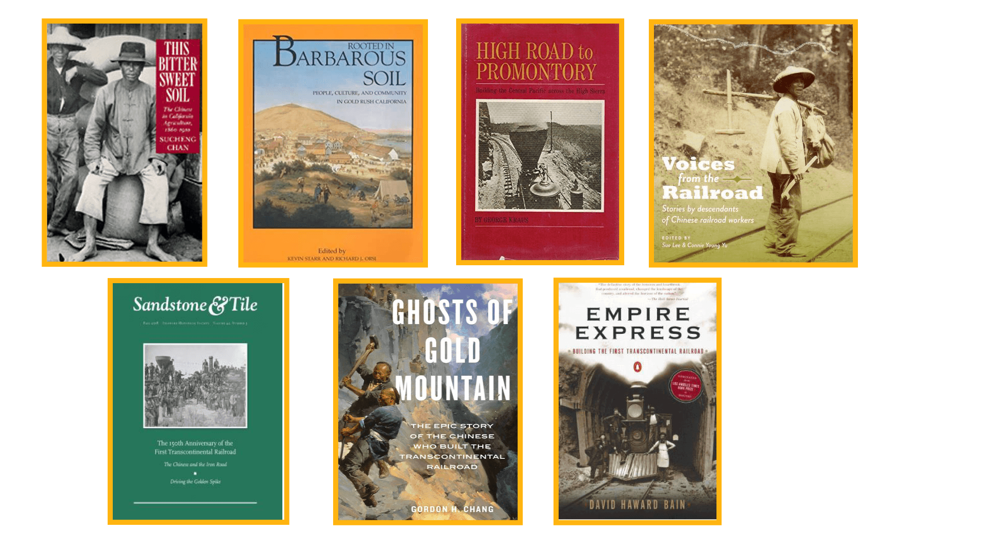 - Chang, Gordon H. Ghosts of Gold Mountain: The Epic Story of the Chinese Who Built the Transcontinental Railroad. New York: Houghton Mifflin Harcourt, 2019.