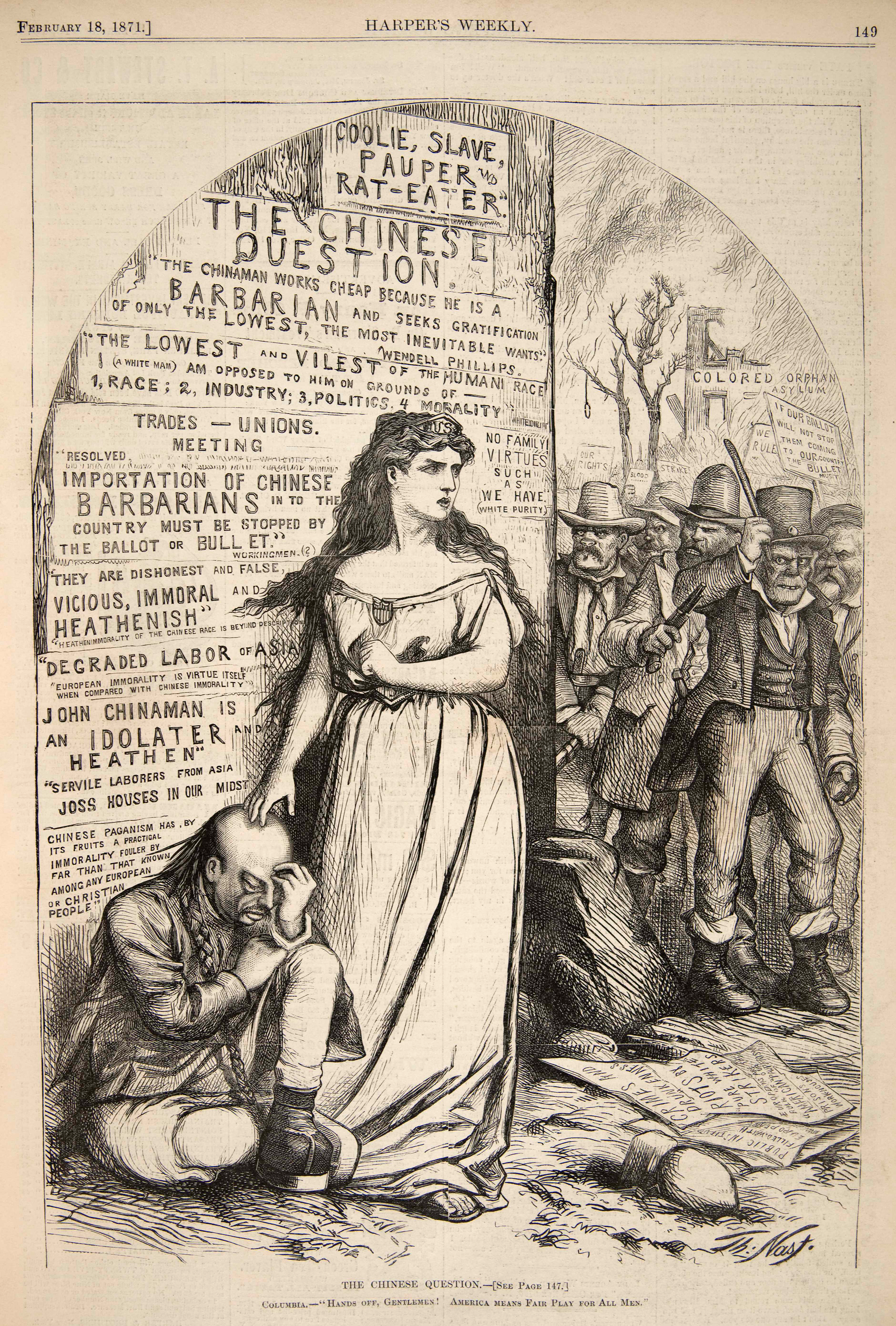 Esta ilustración histórica [abajo] apareció en Harper's Weekly el 18 de febrero de 1871. Expresa el sentimiento anti-inmigrante de la época. Estos términos son despectivos y ofensivos.