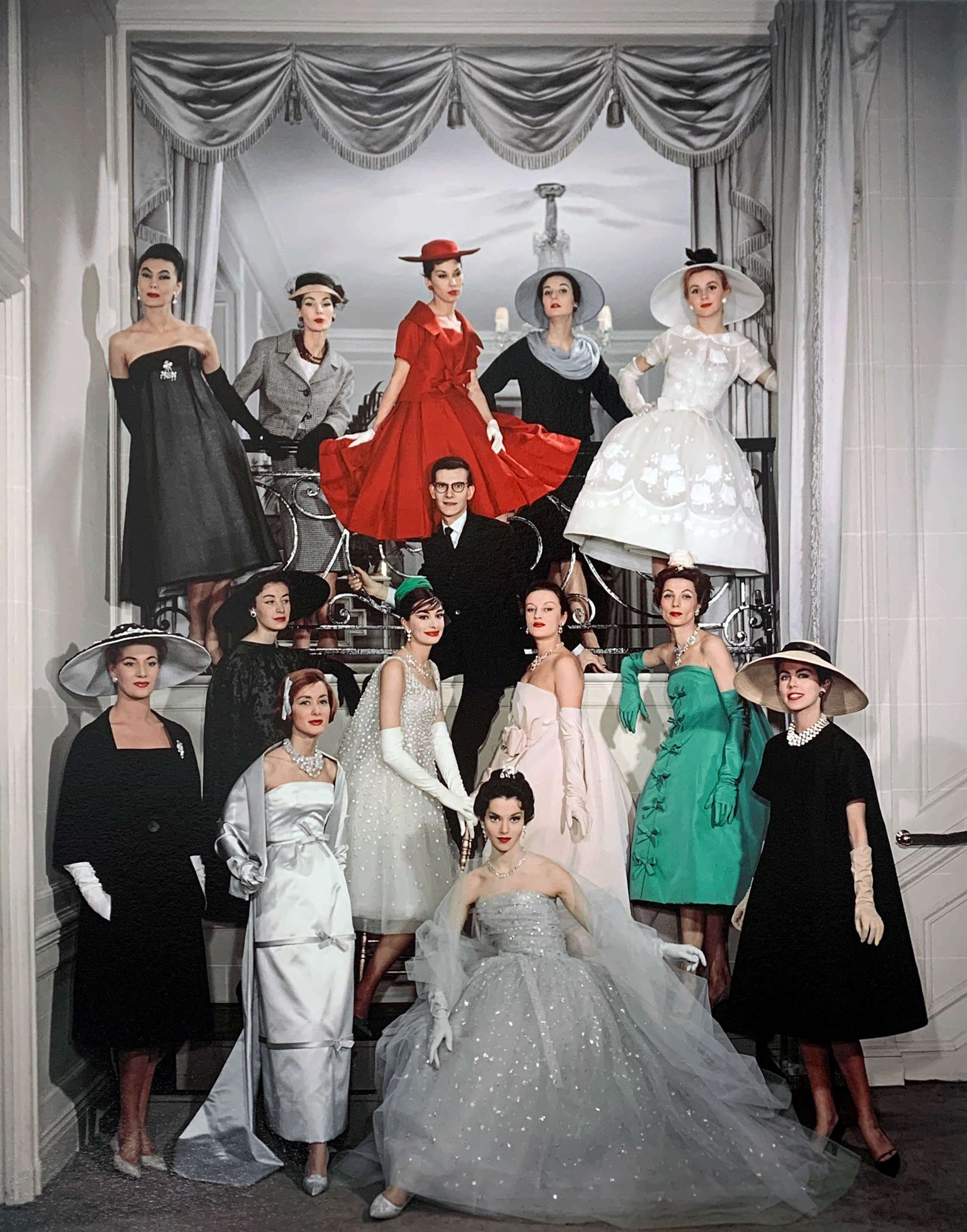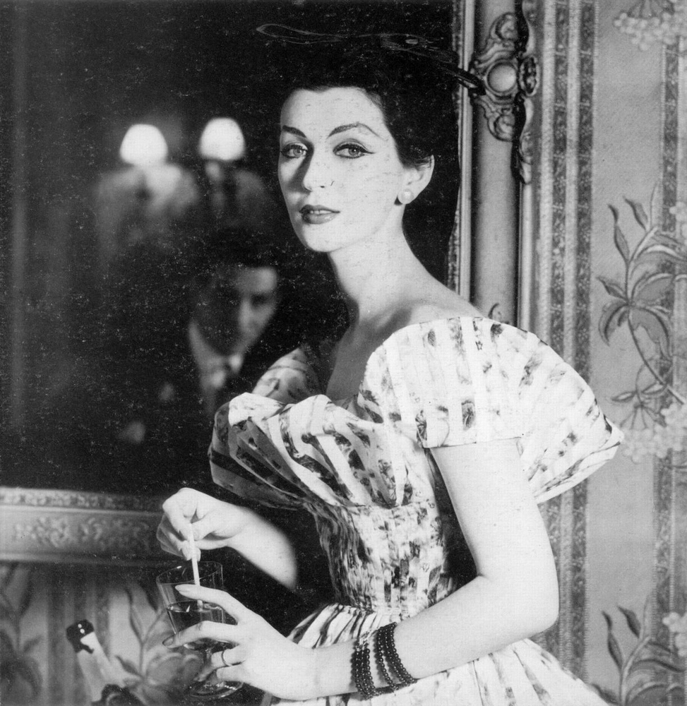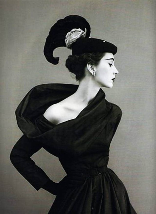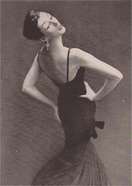 The photo above was taken in August 1955 by Richard Avedon (1923-2004) during a visit to Paris at the behest of Carmel Snow, editor of Harper's Bazaar, under the direct 'supervision' of Diana Vreeland. It was allowed a full page bleed within a 14-page photo essay ("The Carmel Snow Paris Report") in Harper's Bazaar, under the art direction of Alexey Brodovitch. It featured the model Dovima, and gowns by Dior, in particular one of the first designs for Dior by the 21 year old Yves Saint Laurent.