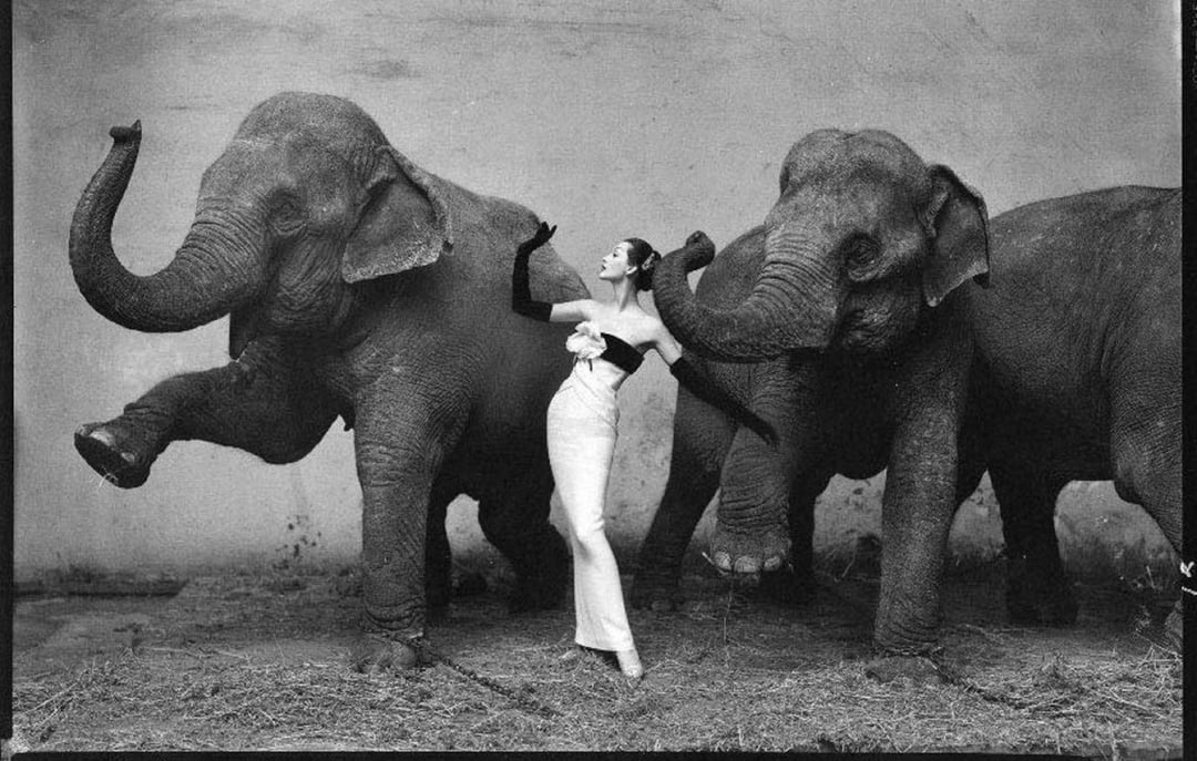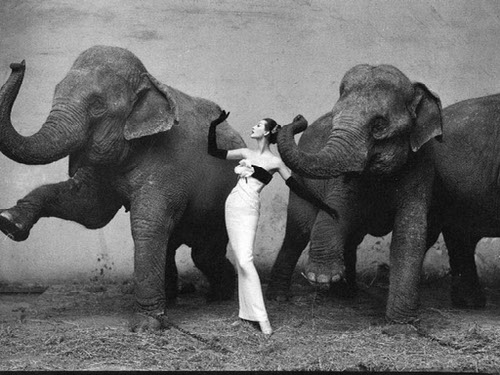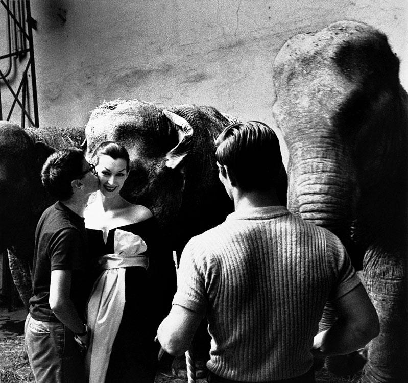 Seeing the elephants of the circus, Avedon immediately chose the location to take an image, later saying, “I saw the elephants under an enormous skylight and in a second I knew that I then had to find the right dress, and I knew that there was the potential here for a kind of dream image.”