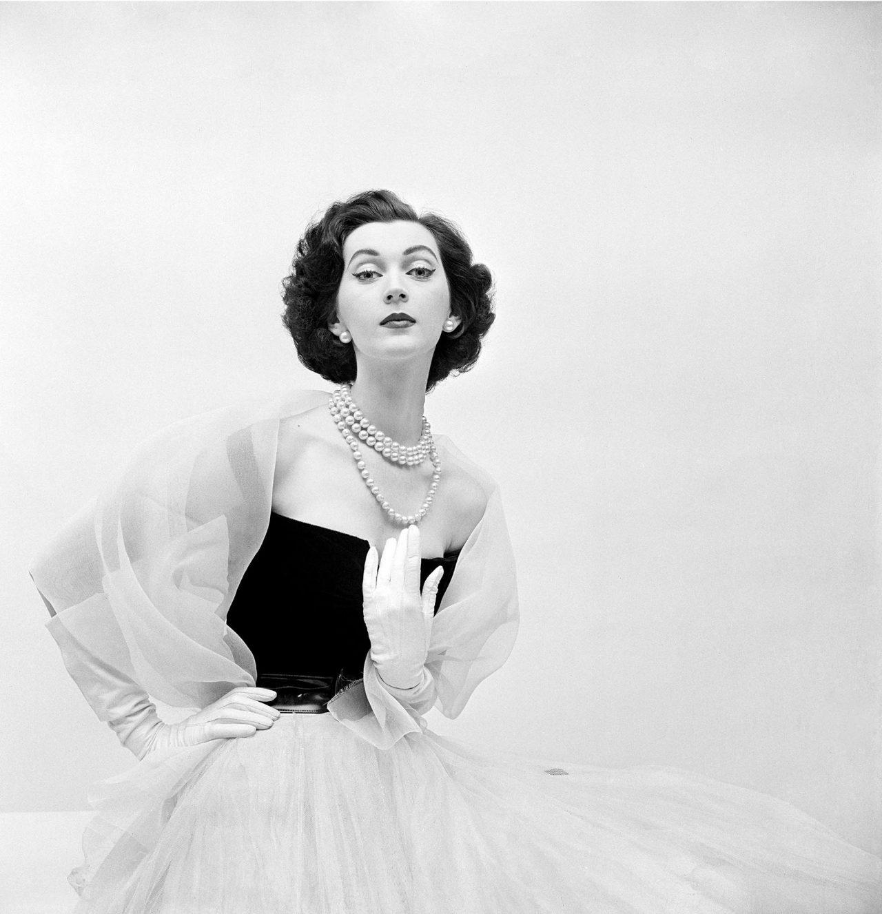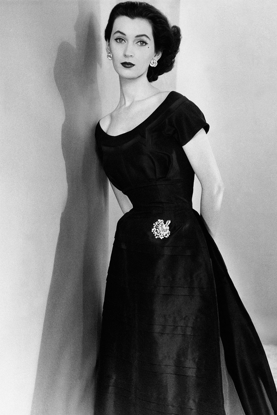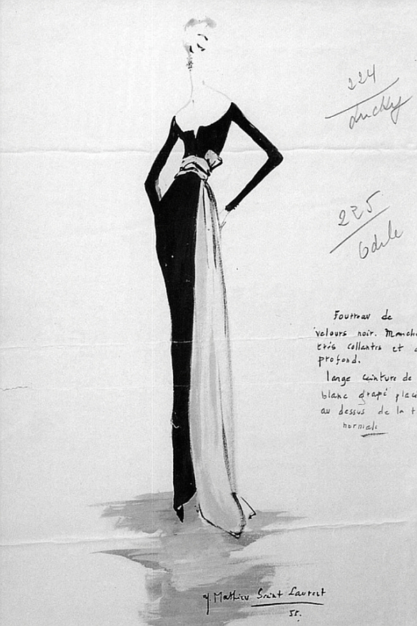 The black evening dress with a white sash, from the first Christian Dior collection to feature evening wear. It was also one of the first designs by Yves Saint Laurent to feature in a Dior collection. Saint Laurent was 19 at the time. Two years later (in August 1957) Dior appointed him as his successor to run his fashion house. A few months later (October 1957) Dior died of a massive heart attack. He was 52.
