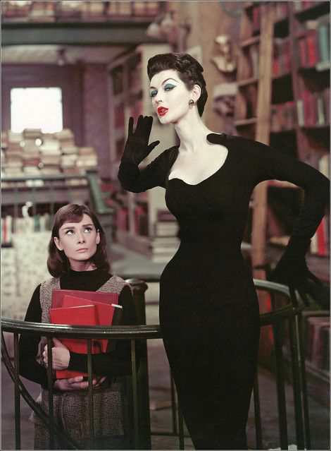 Many of the characters in the film were based on the real people involved in Avedon's various trips to photograph Paris fashions. 'Maggie Prescot' draws on the personalities of Carmel Snow and Diana Vreeland. Dovima plays a model obsessed with comics (as opposed to the very serious minded Audrey Hepburn ('Jo') who runs a second-hand bookshop with an interest in philosophy.