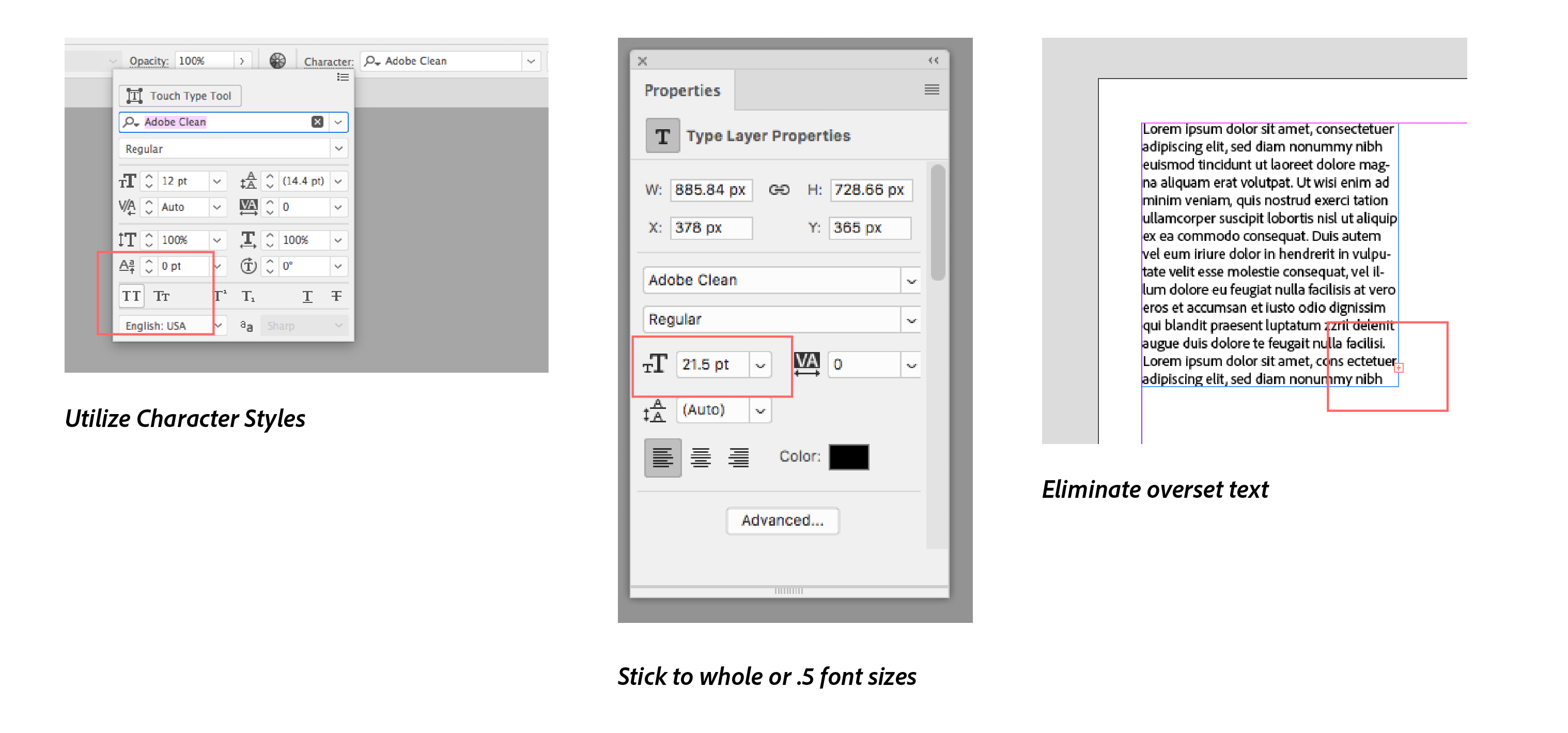 - All text should be in full or .5 pt/px sizes - no other fractional sizes are allowed.