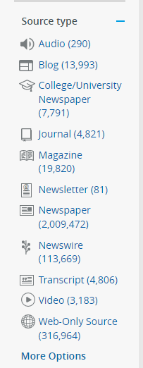 Within Newsbank you can refine your search to show only audio resources, using the Source type filter and choosing Audio.