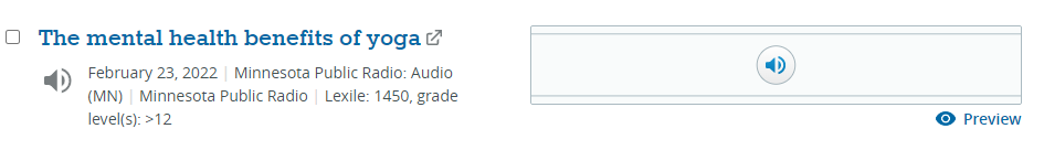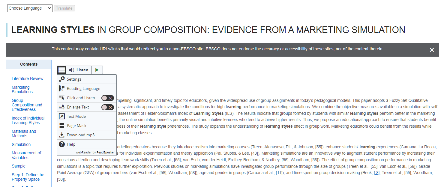 The EBSCO platform includes databases such as: Art Full Text, Business Source Ultimate, CINAHL Ultimate, Education Research Complete, Medline , PsycInfo and more. The Listen feature is available within the EBSCO databases when the HTML Full text is included in the record.